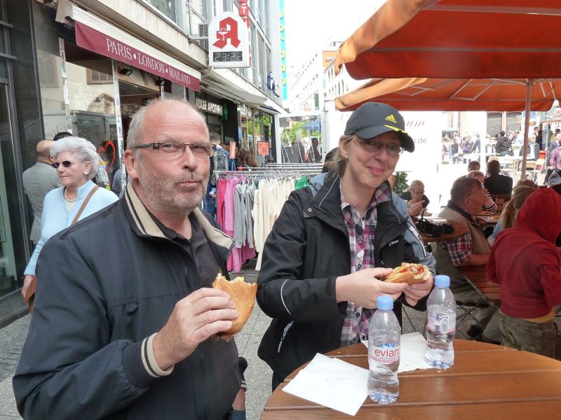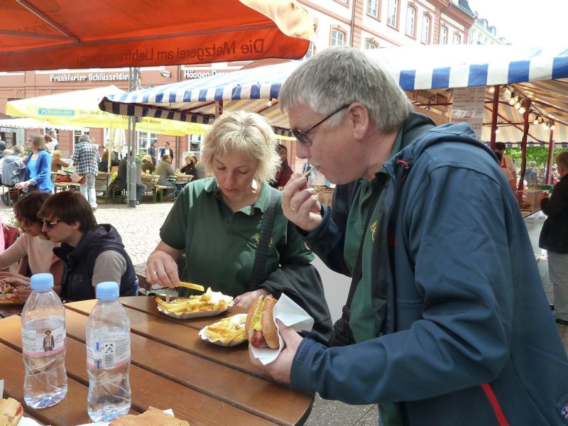 Danach war Zeit die frankfurter Innenstadt auf eigene Faust zu inspizieren. Von der Dachterrasse an der „Zeil“ bot sich ein toller Ausblick über die ganze City mit den Wolkenkratzern im Hintergrund. Natürlich mussten auch original „Frankfurter“ gegessen werden.