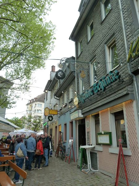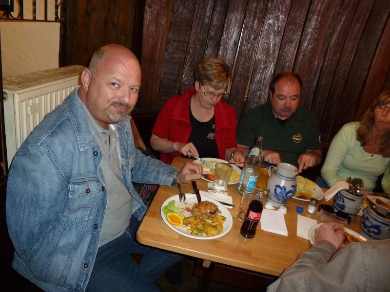 Abends wurde im Lokal „Affentor Schänke“ die Chance geboten, original hessische Gerichte zu probieren. Ebbelwei durfte dazu nicht fehlen. Auf dem Rückweg in die City zum Römerberg lockte uns noch eine urige Kneipe am Mainufer zu einem Absacker. Der Wirt war ein heimisches Original und zeigte mir die Grenzen meines Sprachverständnisses auf und blieb nie eine Antwort schuldig. Hatte ich da meinen Meister gefunden? Leicht beschwingt vom immer leckereren Ebbelwei überquerten wir den Main (wir benutzten die Brücke) und nach der Rückfahrt mit Bus und U-Bahn hatten alle die nötige Bettschwere. Die Sorge um mein Verdauungssystem (wegen des viele „Apfelsaftes“) erwiesen sich als unbegründet.