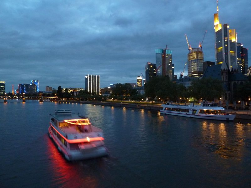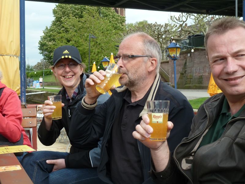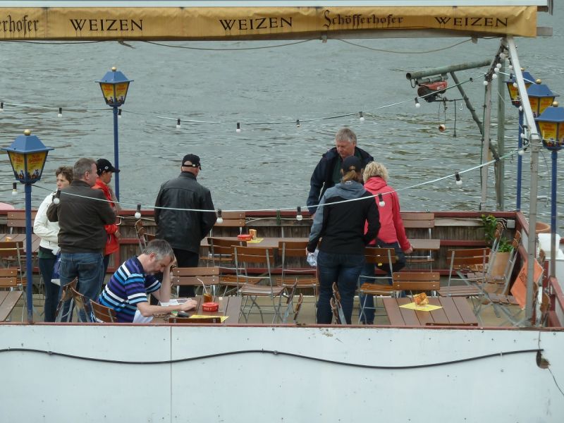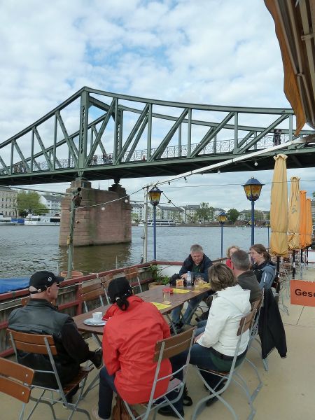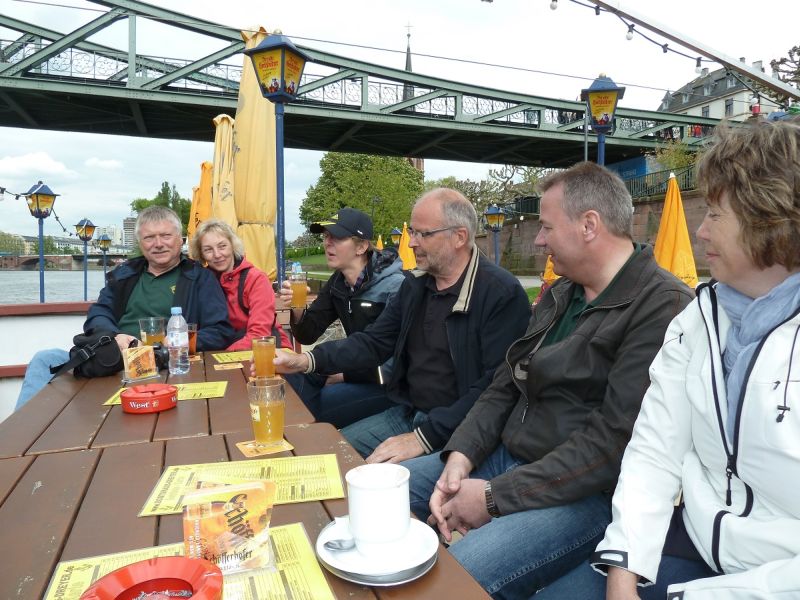 Alle guten Dinge sind drei und so starteten wir auch noch die „City Tour“, die uns bis in den südlich vom Main gelegenen Stadtteil Alt-Sachsenhausen, dem Vergnügungs- und Kneipenviertel von Frankfurt führte. Hier stiegen wir aus, schauten uns das Lokal für den Abend an und gingen am Mainufer entlang zurück zum Römerberg. Natürlich musste zwischendurch der Durst gelöscht werden. Also ab aufs „Bootshaus am Eisernen Steg“ und Ebbelwei trinken. Anfangs gewöhnungsbedürftig, dann aber läuft das hessische Nationalgetränk wie ansonsten das Bier.