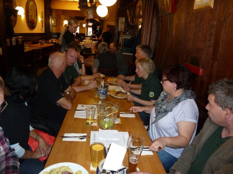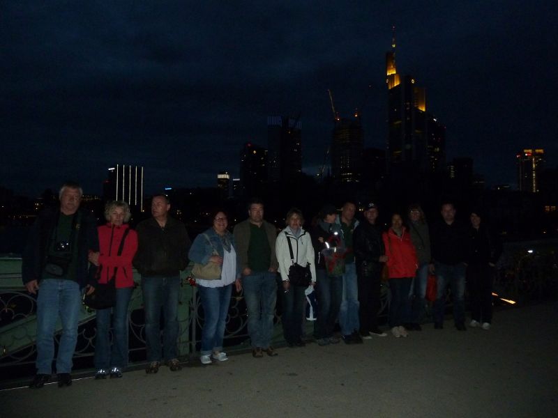 Am ersten Tag, Donnerstag, den 09.05.2013, kamen viele erst abends an. Nach einer wie immer herzlichen Begrüßung trafen sich alle, nachdem die Koffer auf den Zimmern verstaut waren, auf der Dachterrasse des Hotels „Schöne Aussicht“. Das Hotel machte seinem Namen alle Ehre, die Aussicht über Frankfurt war wirklich einzigartig. Der erste Durst wurde gestillt und die neuesten Neuigkeiten ausgetauscht. Für das Abendessen hatte Markus einen gesonderten Raum für uns reservieren lassen. Da die Spargelsaison begonnen hatte, bestellten mehr als die Hälfte das Spargelmenü. Nach dem Essen hielten wir unseren offiziellen Clubabend ab, bei dem Herbert noch einiges über unseren Club berichtete. Markus erläuterte das Programm für den nächsten Tag. An diesem Abend wurde es nicht spät (die Clubmitglieder werden halt älter). Die meisten gingen auch schon früh zu Bett (Michael Bartsch musste noch fernsehen, obwohl Mirjam dabei war!?, sonst schläft er nicht ein), da am nächsten Tag die Sightseeing Tour durch Frankfurt angesagt war.