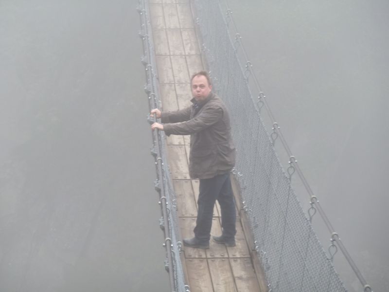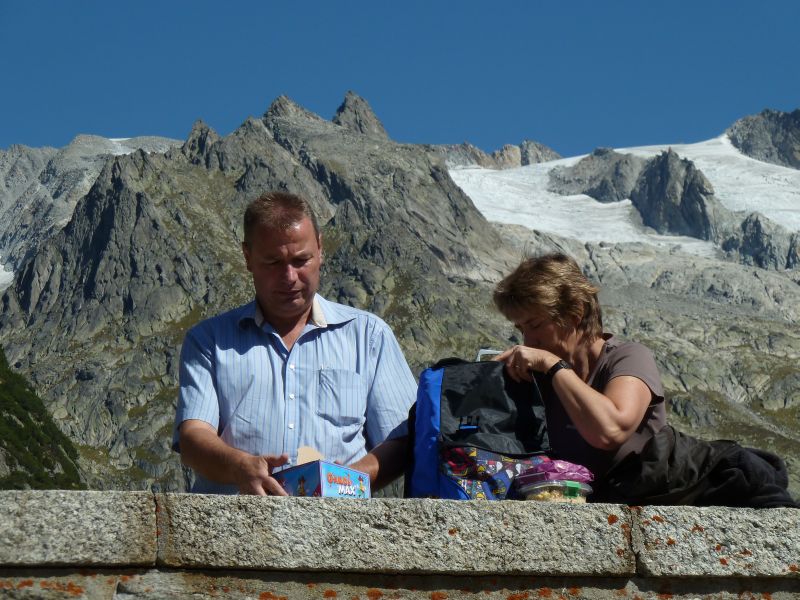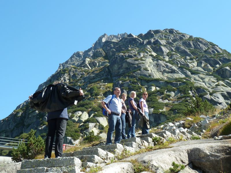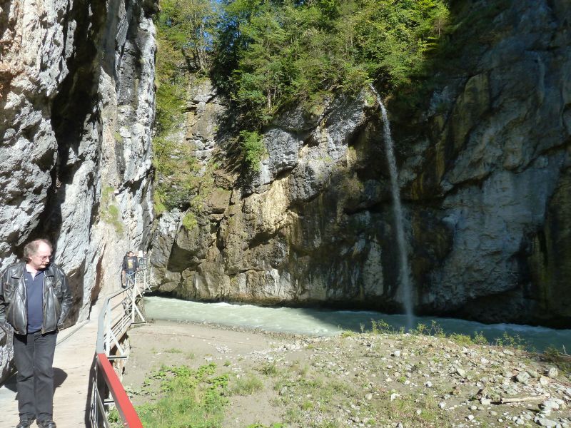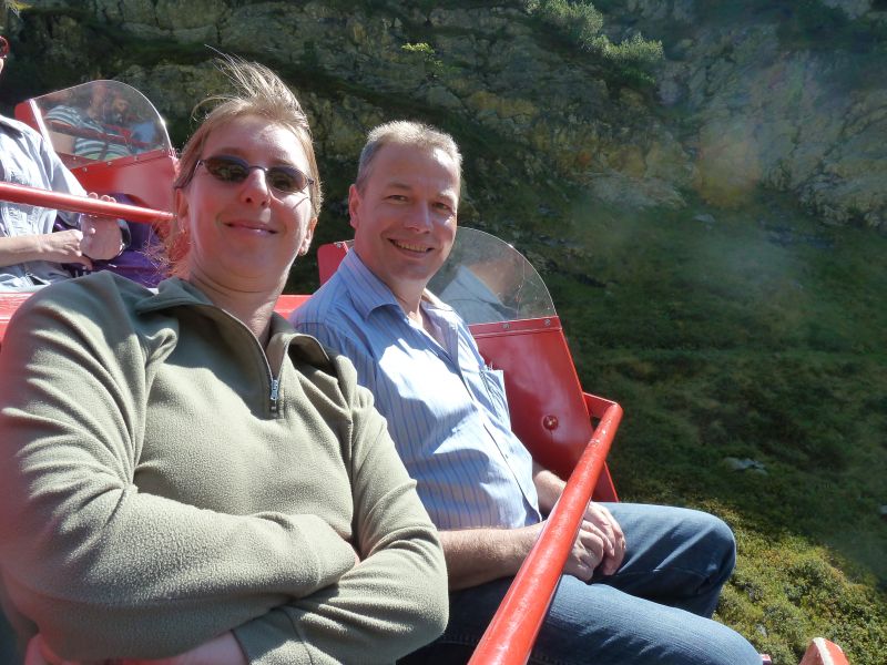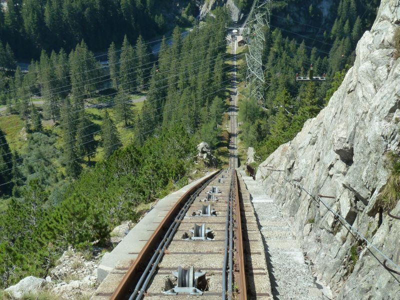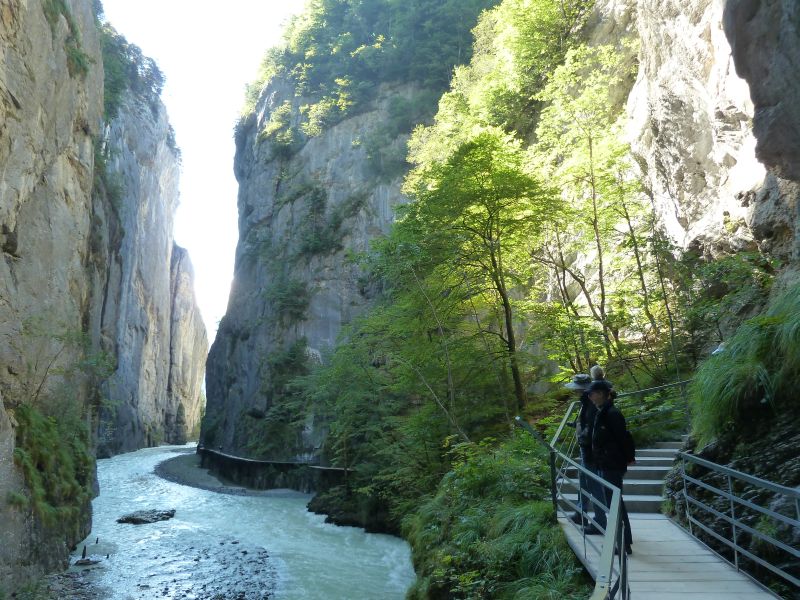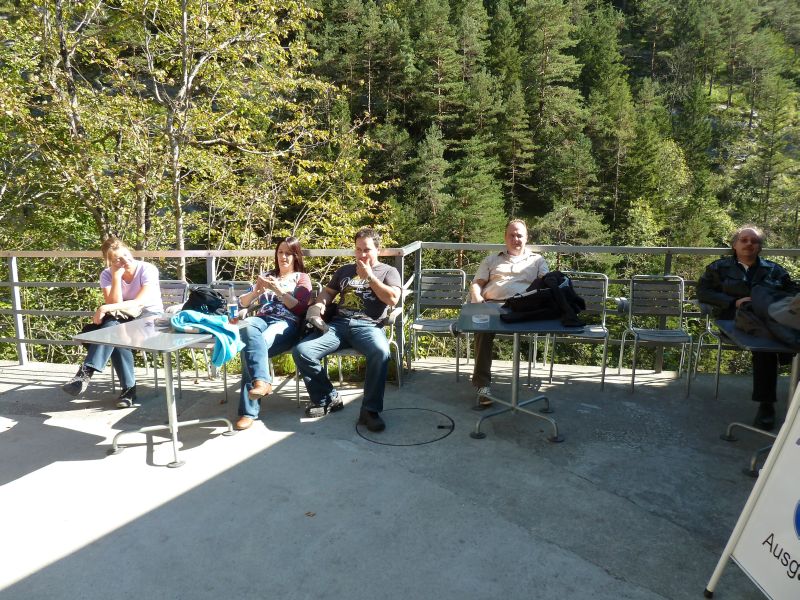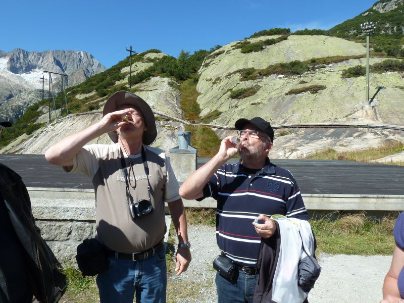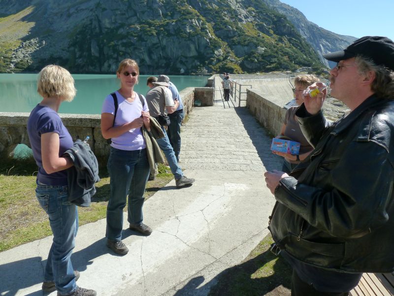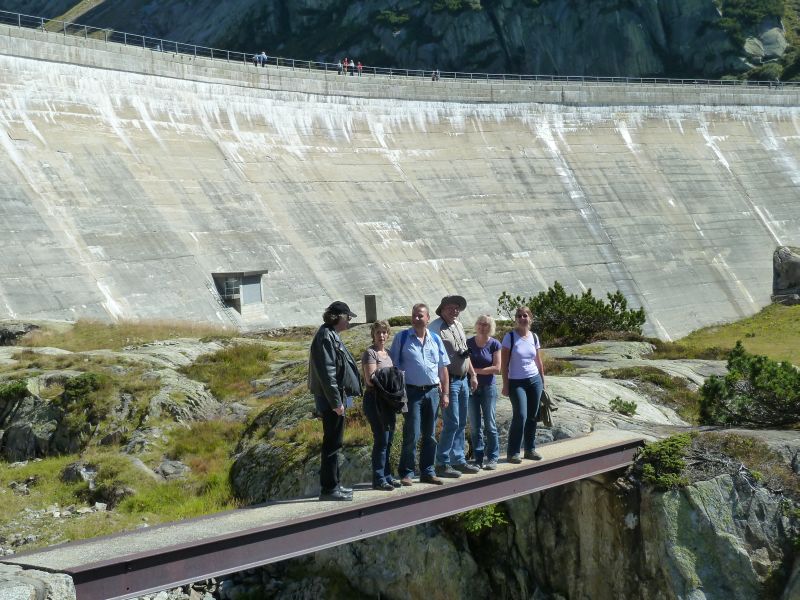 Am Donnerstag, den 15.09.2011 reisten die meisten an. Für die Anwesenden hatte René und Erika aber schon ein Programm geplant. Wir besuchten die Aareschlucht, das Tor zur Grimselwelt und durchwanderten den 1,4 km langen Spalt in beide Richtungen. Es ging über teilweise frei an die Felswand montierte Stege und Tunnel durch eine Felsspalte, die an einigen Stellen nur einen Meter breit ist und bis zu 200 Metern emporragt. Von dort ging es noch einmal bis zur Gelmerbahn. Nervenkitzel für nicht Schwindelfreie, denn 106 Prozent Steigung an einer Stelle macht sie zur steilsten Standseilbahn in Europa. Oben wanderten wir über die Staumauer des türkisblauen und grün schimmernden Gelmersees. Da brauchten alle einen Schnaps. Erika hatte vorgesorgt. Zum Schluss konnten wir die Handeckfallbrücke bei klarer Sicht bewundern. Man braucht doch etwas Mut für die Überquerung. Wieder zurück im Hotel waren schon fast alle angereist.