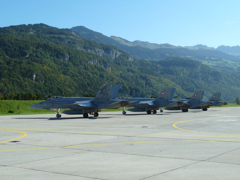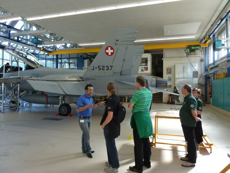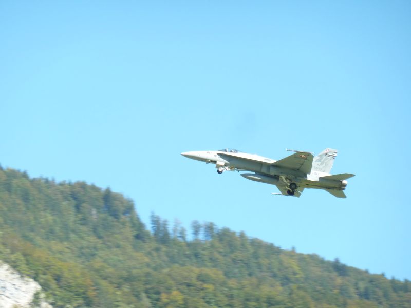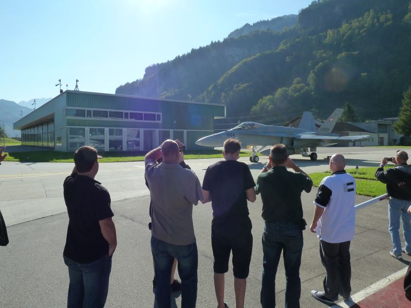 Am Freitag, den 16.09.2011 ging die Fahrt früh morgens entlang des Nordufers des Brienzersees nach Meiringen. Hier erwartete uns etwas besonderes: Einer von drei schweizer Militärflughäfen. In einer zweistündigen Führung erlebten wir das Geschehen auf einem derartigen Flughafen in unmittelbarer Nähe. Wir waren gehalten, trotz Sonne auf eine Kopfbedeckung zu verzichten. Später wussten wir warum. Nach der Besichtigung des Fuhrparks zur Sicherheit und Betriebsbereitschaft des Flugplatzes kam die große Überraschung. Vier MDD SF 18 Hornet kamen aus den Hangars im Berg. Die Piloten grüßten uns, schwenkten mit dem Heck in unsere Richtung (ganz schön warm und –jetzt klar, warum keine Kopfbedeckung-zügig) und stellten sich direkt vor uns zum Abflug auf. Was dann kam war der pure Wahn. Tausende PS, also wie ein paar Omegas, ließen die Erde und unsere Körper erbeben. Hintereinander hoben die Maschinen vor uns ab. Ein tolles Bild am Himmel. Die Führung ging weiter und am Ende standen wir wieder draußen. Und dann kamen die vier zurück. Der erste setzte zur Landung an, berührte kurz den Boden und gab dann Vollgas um durchzustarten. Wir waren hin und weg und dachten an einen Zufall. Doch auch die anderen zeigten uns, wie man den Flieger beherrscht.
