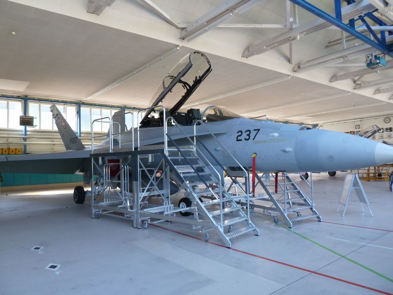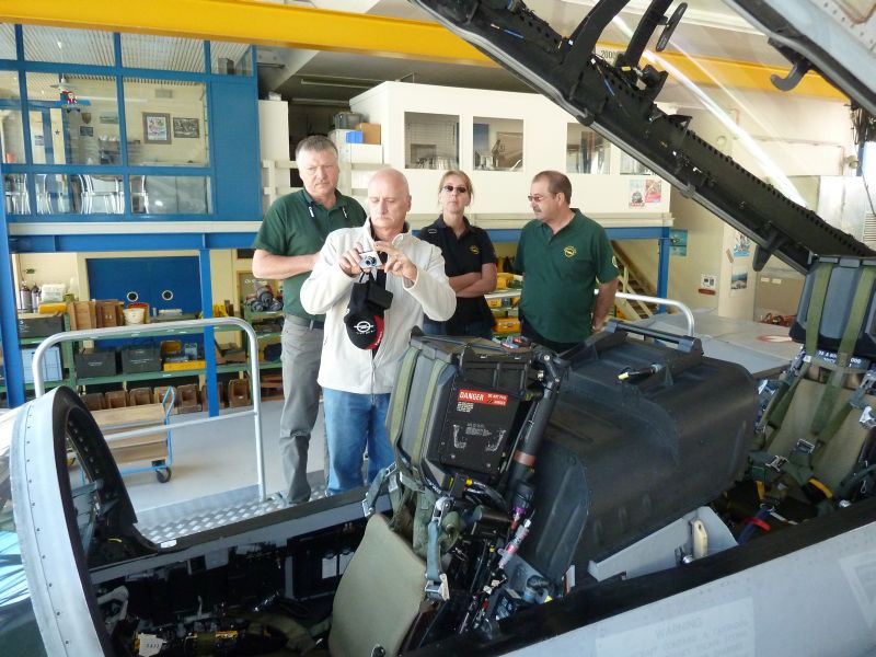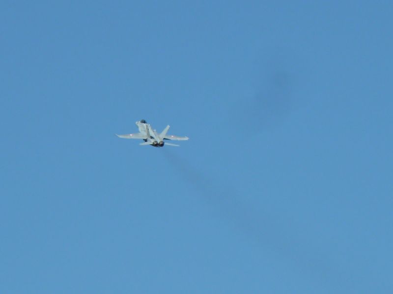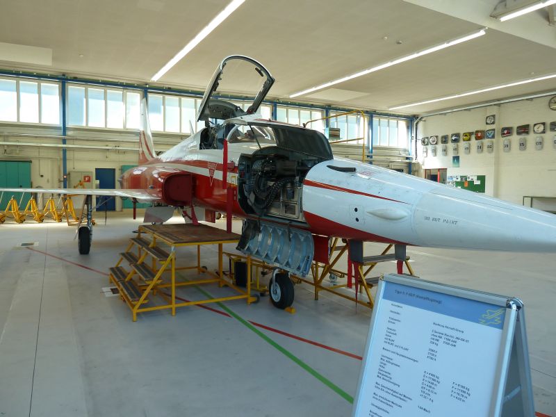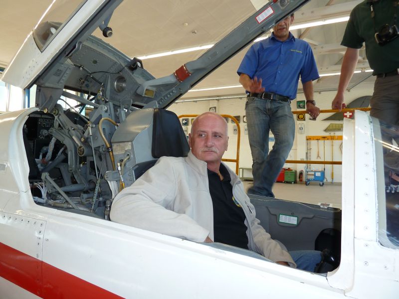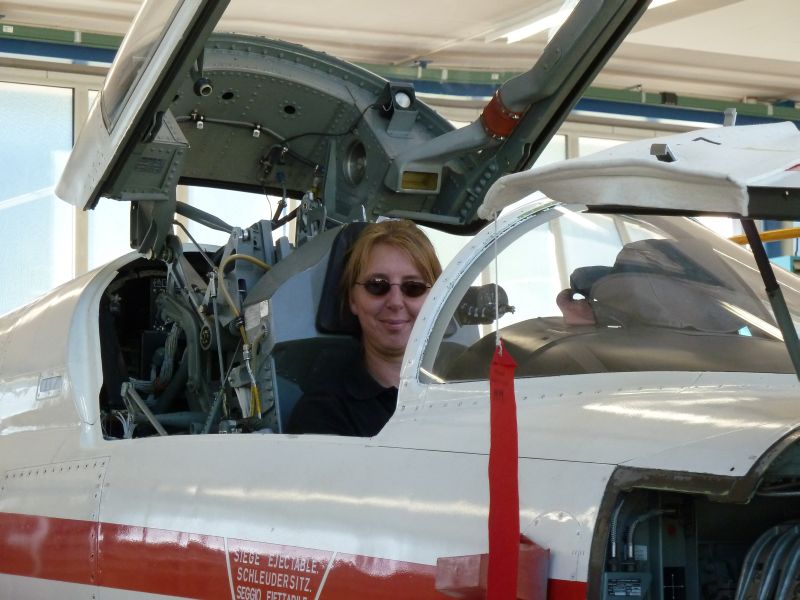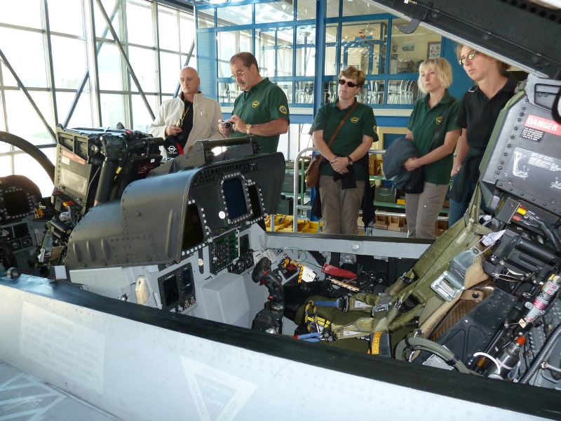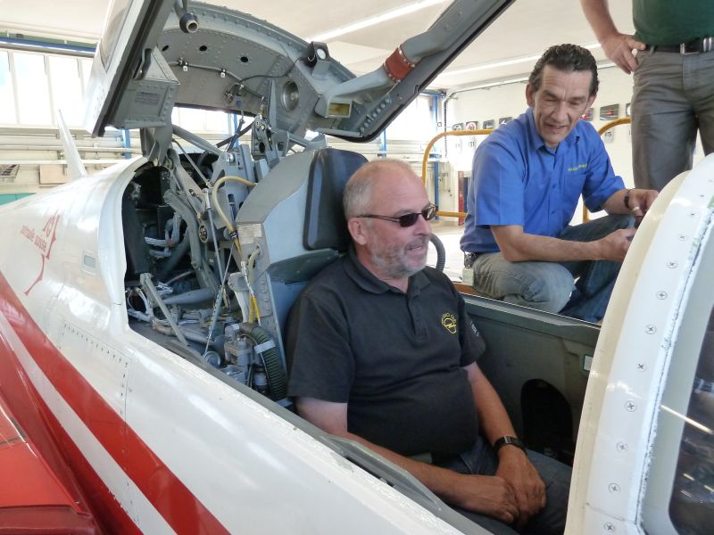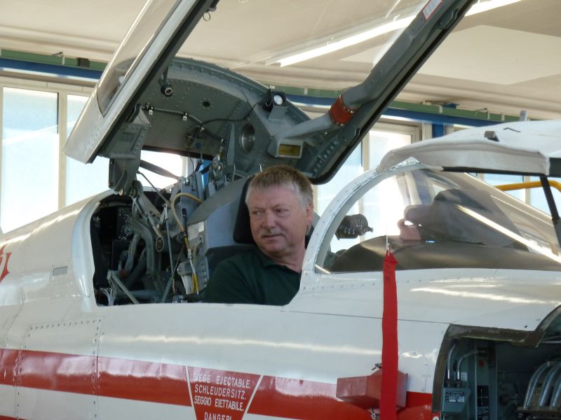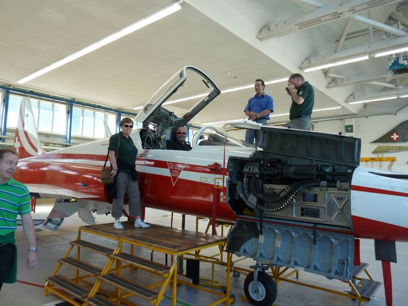 Alle starteten durch –ein wunderbarer Höllenlärm-, drehten eine Runde und kamen dann endgültig rein. Die vier rollten an uns vorbei zurück in den Hangar. Wir winkten den Piloten zu, und ich denke, die waren stolz auf ihre Arbeit an einem derartig anspruchsvollen Arbeitsplatz. Wir waren, zumindest teilweise, neidisch auf deren Möglichkeiten und den zur Verfügung stehenden Pferdestärken. Ach ja, wir durften auch in einer „Tiger“ der Schweizer Kunstflugstaffel „Patrouille Suisse“ Platz nehmen und in der Wartungshalle die „Hornet“ aus nächster Nähe besichtigen. Schon als kleiner Junge wollte ich Pilot werden und………….René und Erika sei Dank, es war etwas wirklich Besonderes und wir wissen nicht, welche geheimen Verbindungen die beiden zur Schweizer Luftwaffe haben.