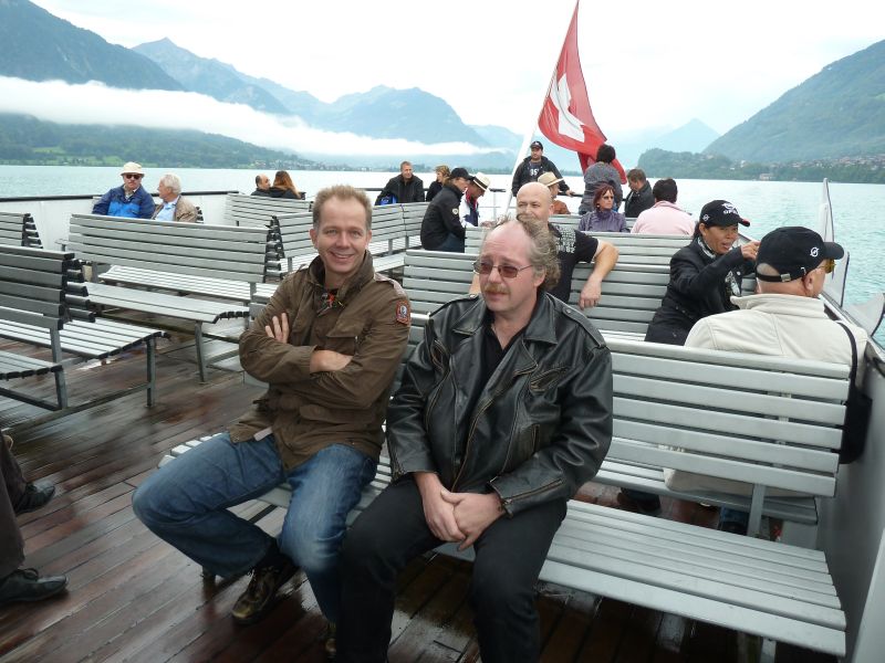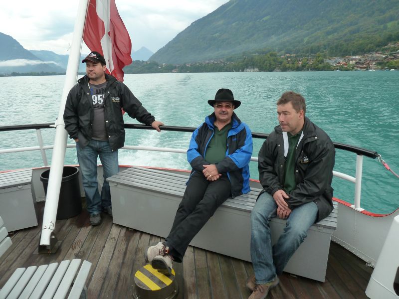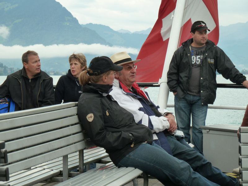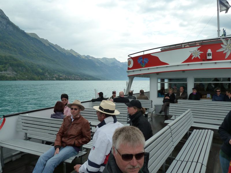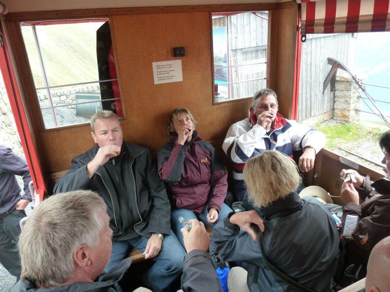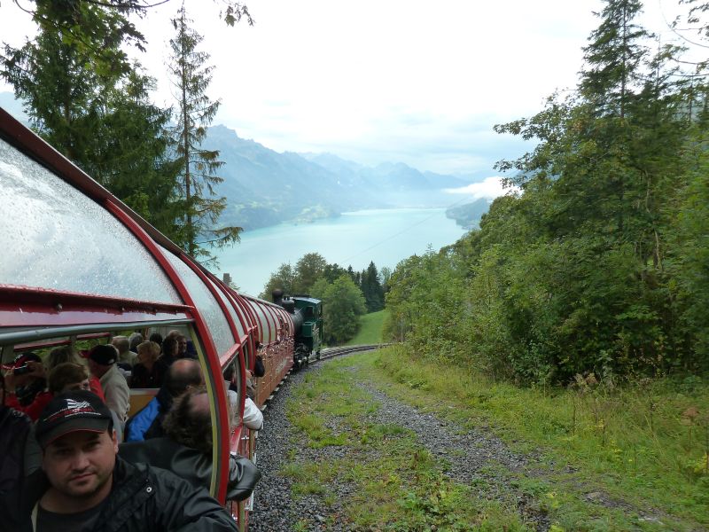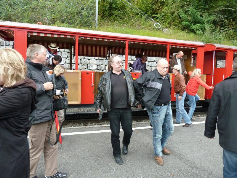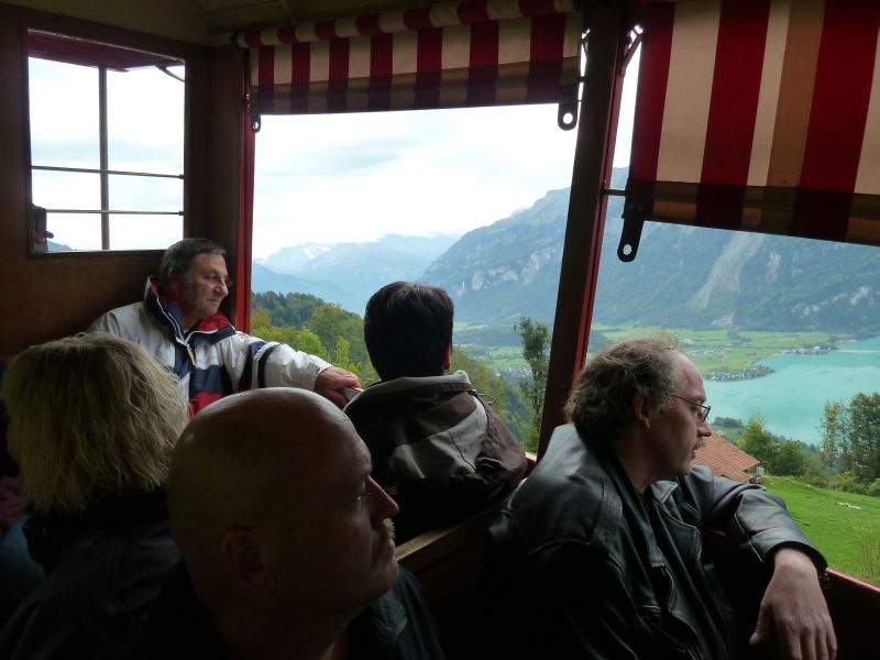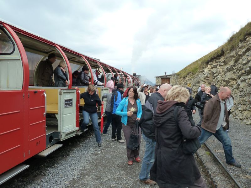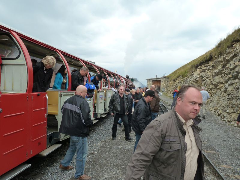 Am Samstag, den 17.09.2011 Stand eine Bootsfahrt über den Brienzersee mit anschließender Dampfzugfahrt auf das Rothorn auf dem Programm. Direkt gegenüber unserem Hotel stiegen wir auf das Linienschiff, das im Zickzackkurs über den See pendelnd bis in den Hafen von Brienz fuhr, direkt gegenüber dem Bahnhof der Brienzer Rothornbahn. René und Erika hatten Wagons für unseren Club reserviert. Das Besondere dieser Zahnradbahn sind die Züge mit den echten Dampflokomotiven und den offenen Wagen. Hier gibt es noch richtige Mechanik und traditionellen Maschinenbau zu bewundern. Ein Leckerbissen für Eisenbahnfans und Technikbegeisterte. Nach einer Stunde und zwanzig Minuten hatten wir den Bahnhof unterhalb des Gipfels in 2.350 Meter Höhe erreicht. Das Wetter war an diesem Tag durchwachsen. Ein paar Tropfen hatten wir abbekommen.