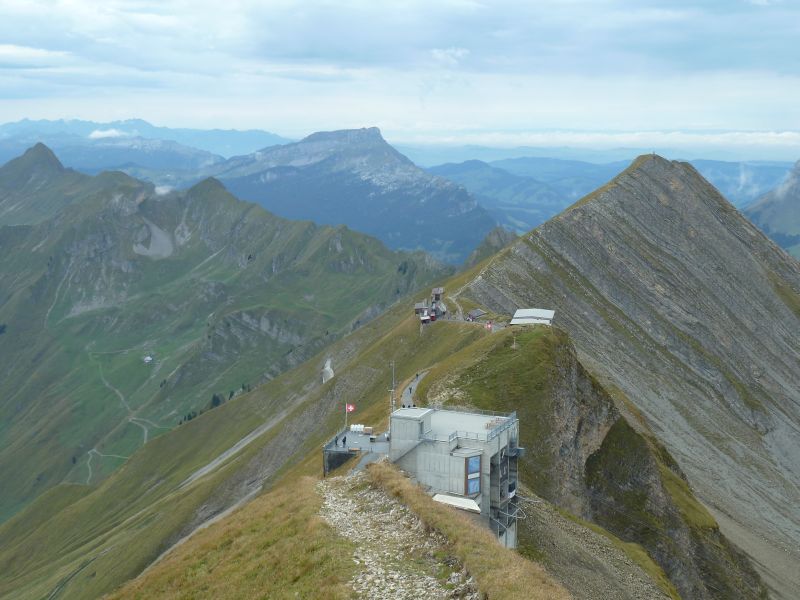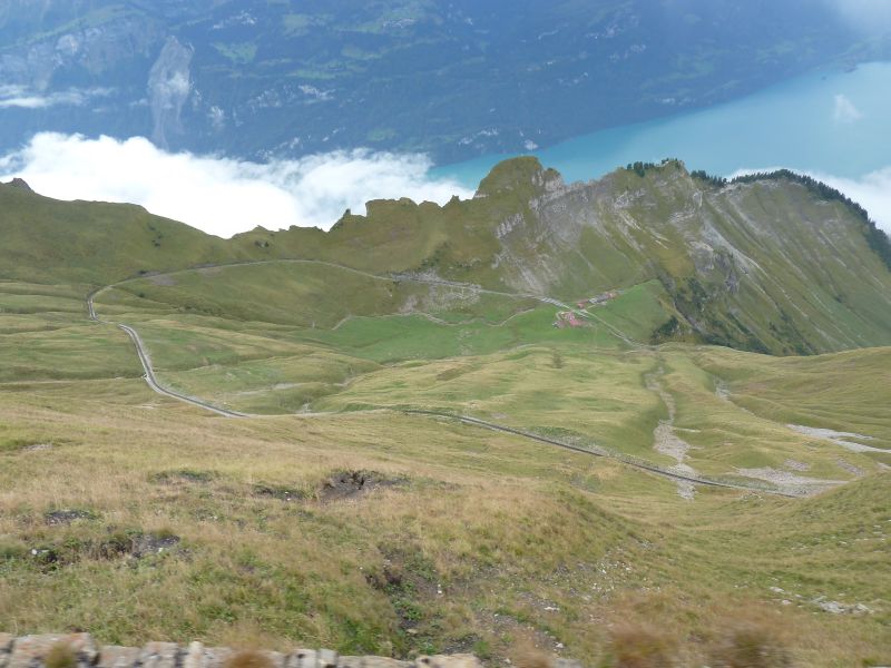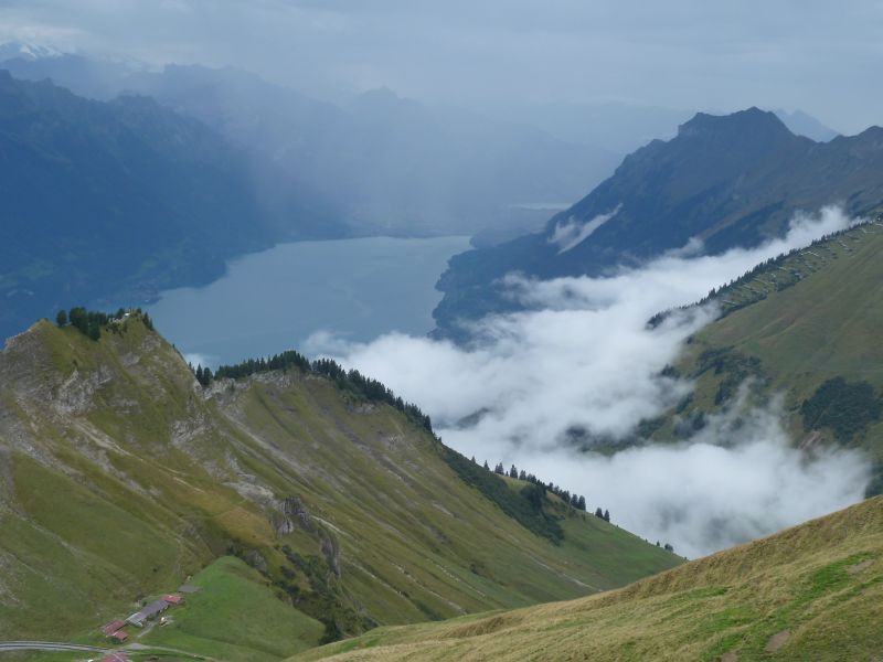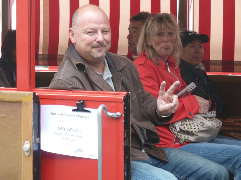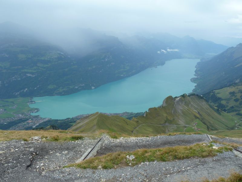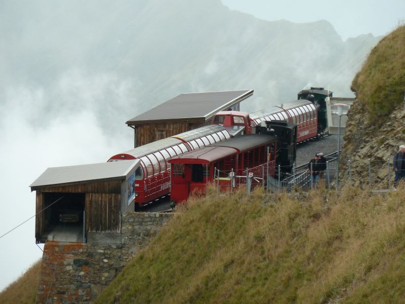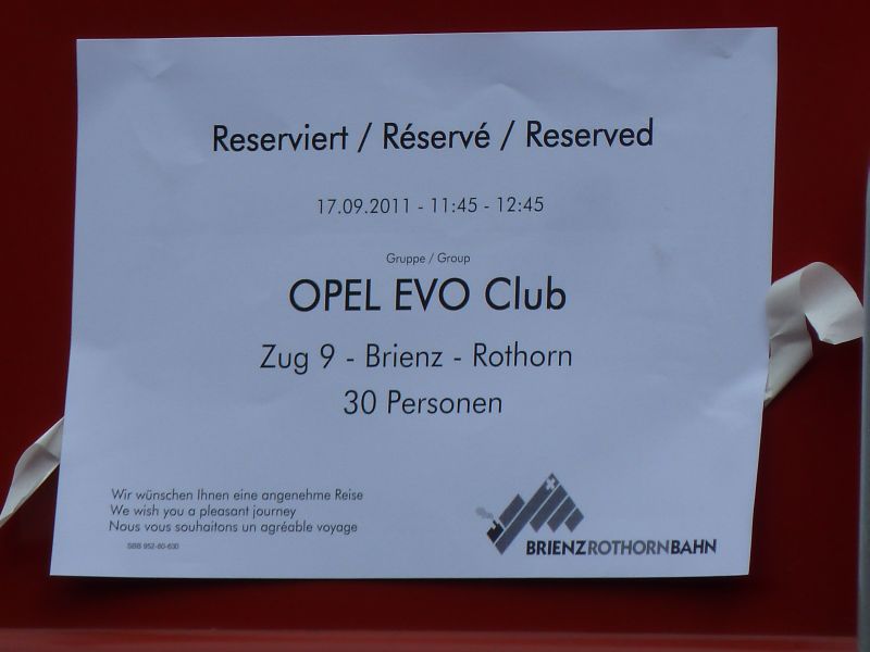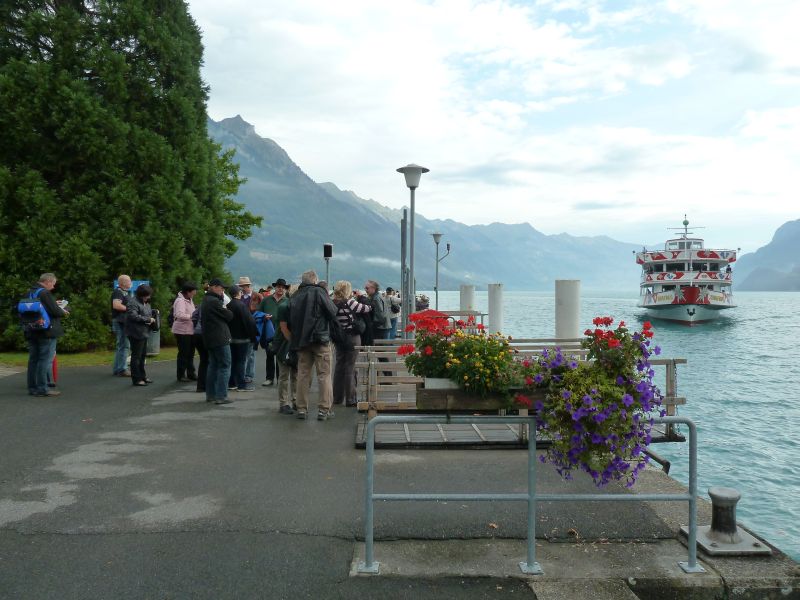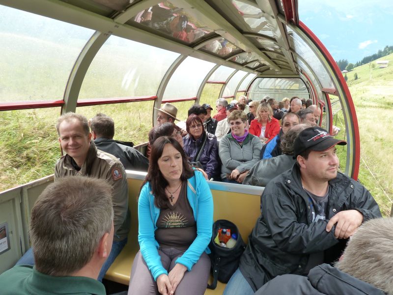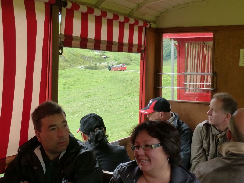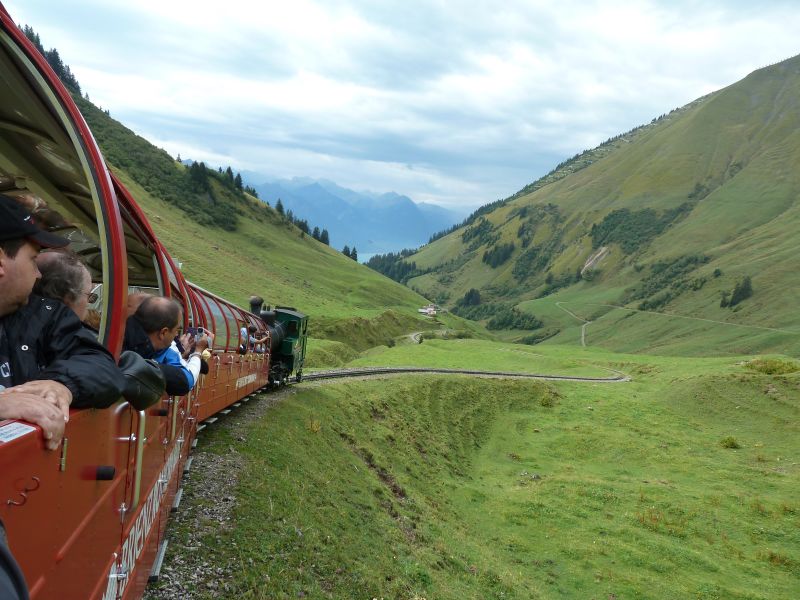 Am Samstag, den 17.09.2011 Stand eine Bootsfahrt über den Brienzersee mit anschließender Dampfzugfahrt auf das Rothorn auf dem Programm. Direkt gegenüber unserem Hotel stiegen wir auf das Linienschiff, das im Zickzackkurs über den See pendelnd bis in den Hafen von Brienz fuhr, direkt gegenüber dem Bahnhof der Brienzer Rothornbahn. René und Erika hatten Wagons für unseren Club reserviert. Das Besondere dieser Zahnradbahn sind die Züge mit den echten Dampflokomotiven und den offenen Wagen. Hier gibt es noch richtige Mechanik und traditionellen Maschinenbau zu bewundern. Ein Leckerbissen für Eisenbahnfans und Technikbegeisterte. Nach einer Stunde und zwanzig Minuten hatten wir den Bahnhof unterhalb des Gipfels in 2.350 Meter Höhe erreicht. Das Wetter war an diesem Tag durchwachsen. Ein paar Tropfen hatten wir abbekommen.