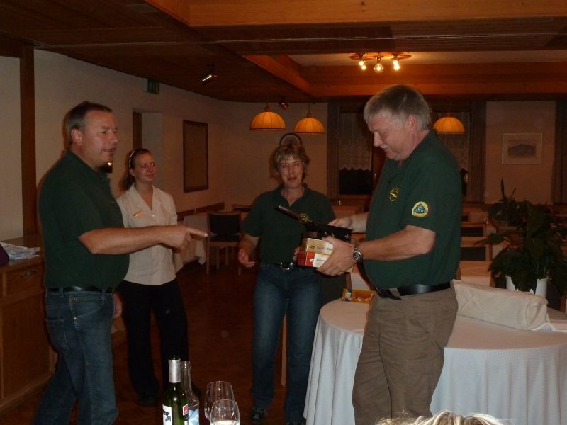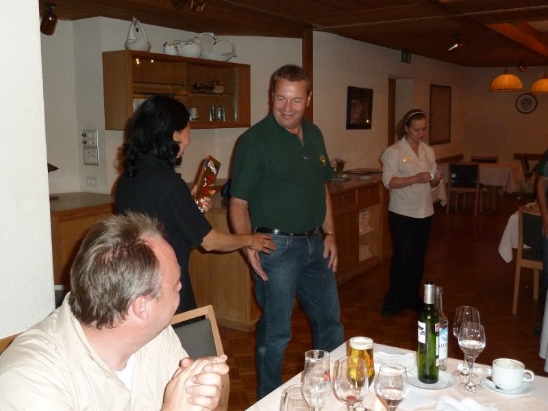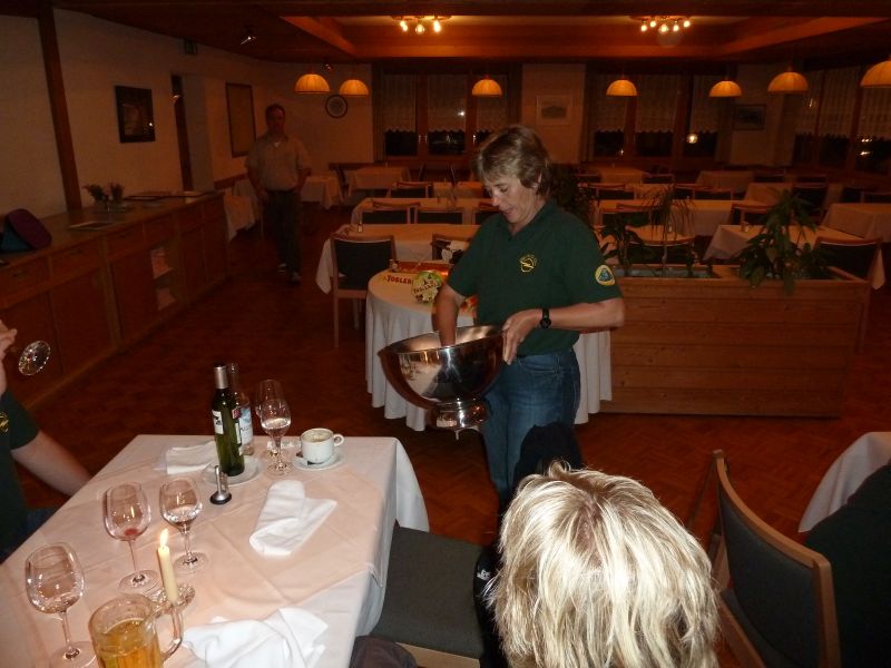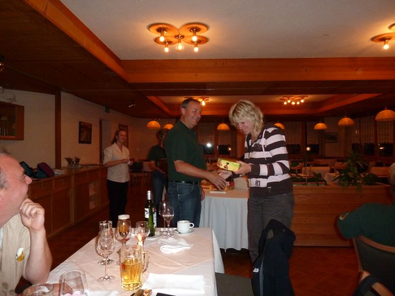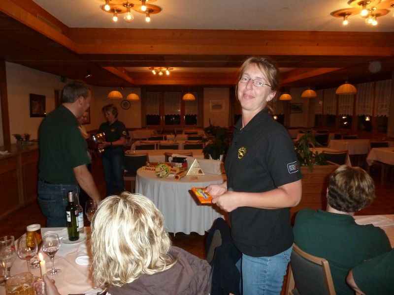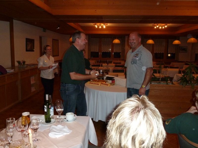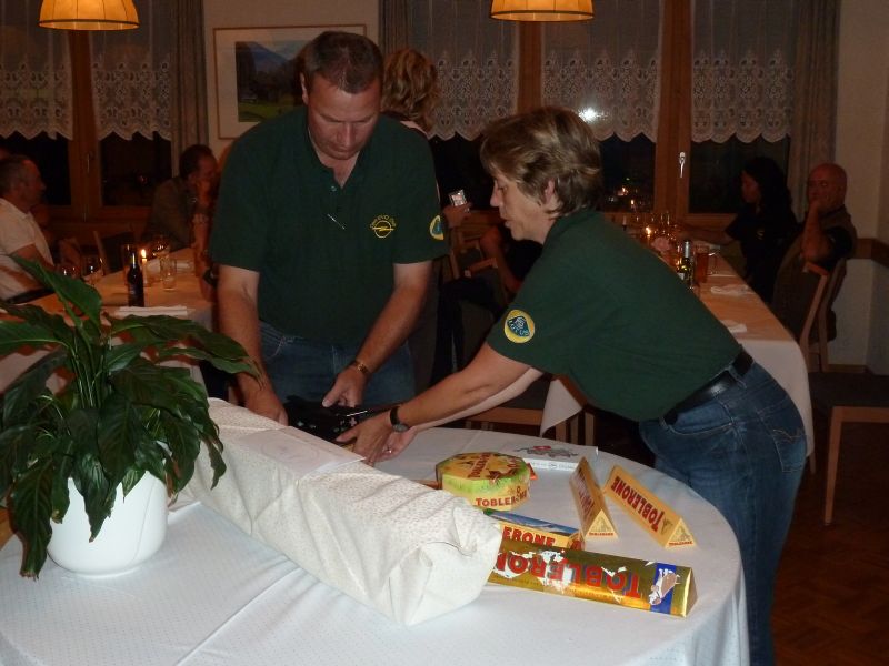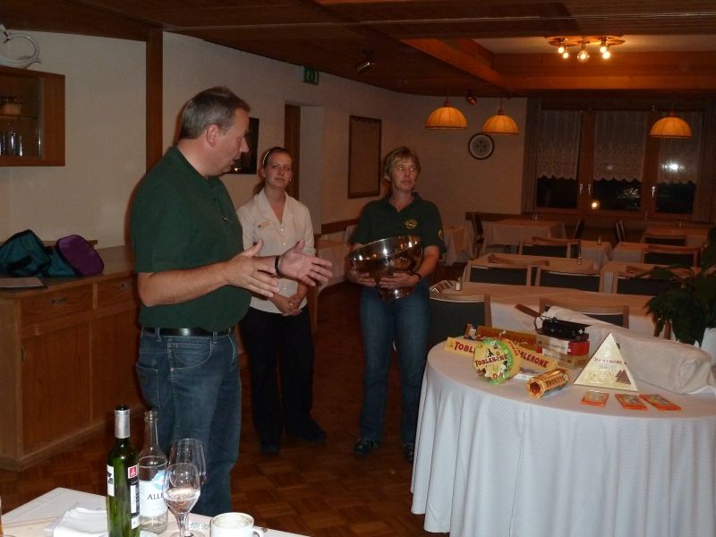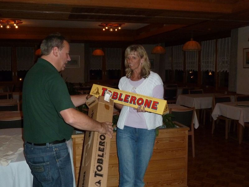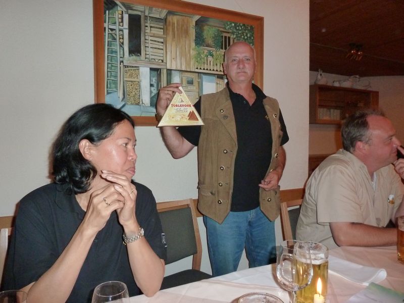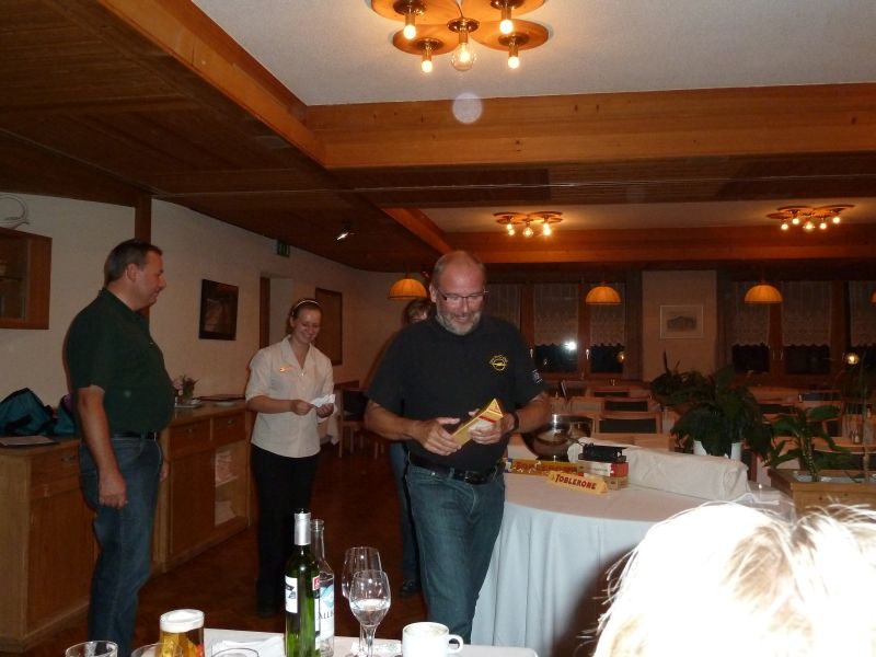 Wieder zurück in Brienz ging es per Schiff wieder zurück ins Hotel. Für den Abschlussabend gab es eine Überraschung. René und Erika hatten uns einen Rätselbogen mit Fragen zur Region ausgehändigt, der in den Tagen ausgefüllt werden musste. Am Abschlussabend gab es für die richtigen Einlösungen eine Verlosung von Preisen der Firma Toblerone, von klein bis riesengroß. Der Hauptgewinn von 4,5 Kilogramm Toblerone ging an Miriam. Was das für Auswirkungen auf der Personenwaage nach sich zog, ist nicht überliefert.
