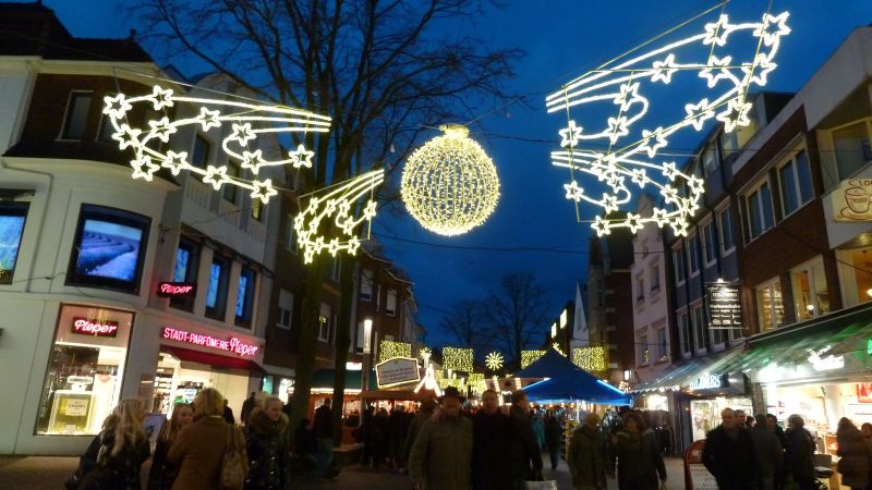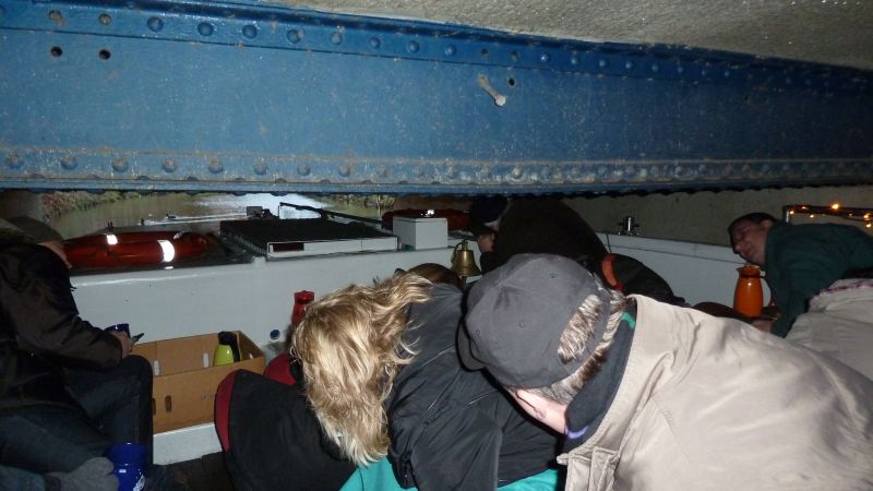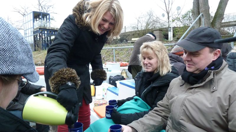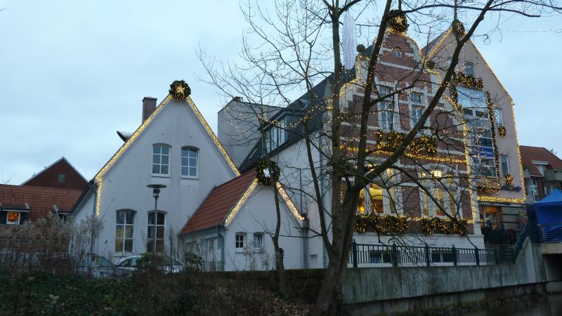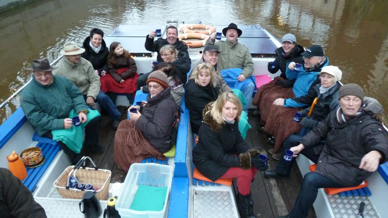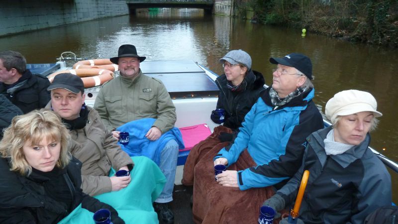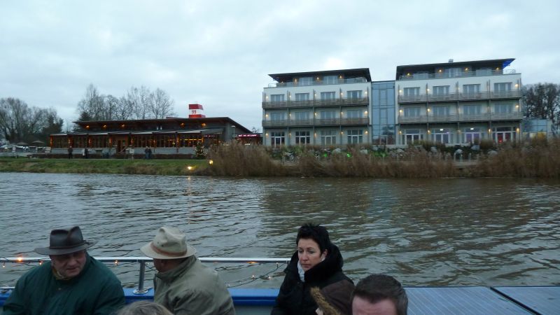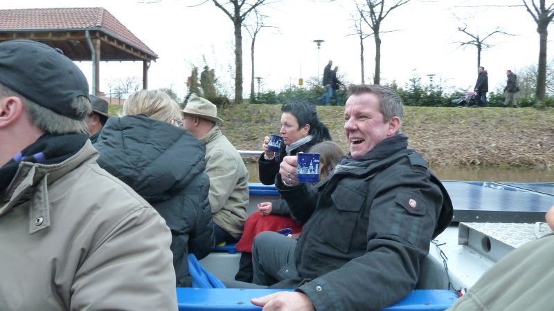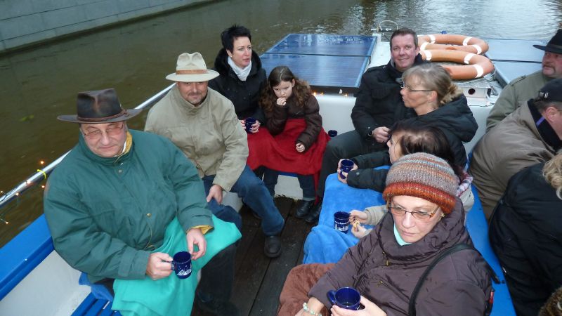 Ab 13.00 Uhr trafen wir uns im Restaurant und nach der obligatorischen Befriedigung des Verdauungssystems wanderten wir von dort am See entlang Richtung Stadtzentrum. Dieses ist von zwei Armen der Vechte umschlossen. Bevor es auf den Weihnachtsmarkt ging, umrundeten wir den Stadtkern auf dem wohl flachsten Ausflugsbot der Welt. Versorgt wurden wir mit Glühwein und Spekulatius. An den meisten Brücken wurde uns klar, warum das Boot so flach sein musste. Das Emsland ist halt plattes Land, kaum höher als der Wasserspiegel der Vechte. So sind auch die Brücken sehr sehr niedrig. Wer nicht noch zusätzlich seinen Kopf einzog, der hatte im wahrsten Sinne des Wortes zwar kein Brett, aber einen Träger vor dem Kopf.