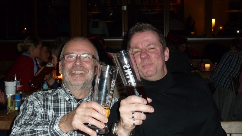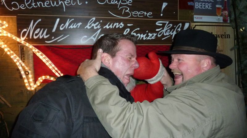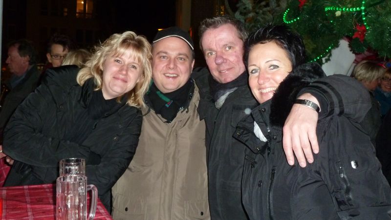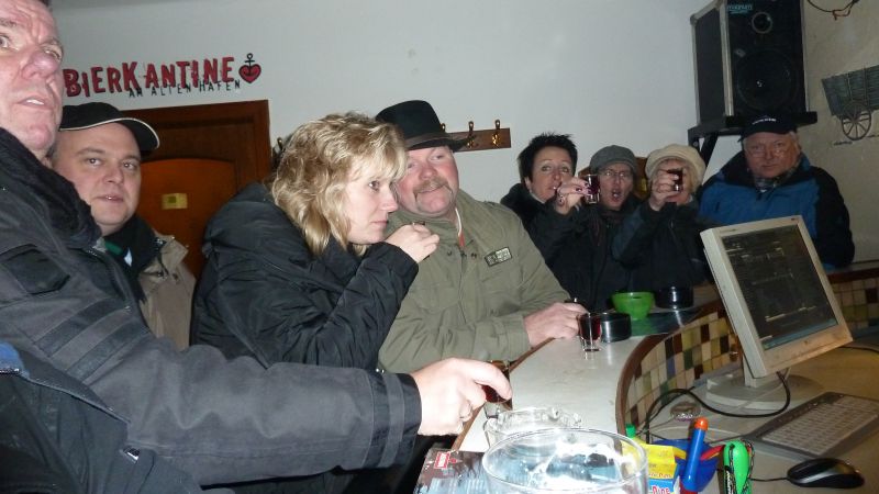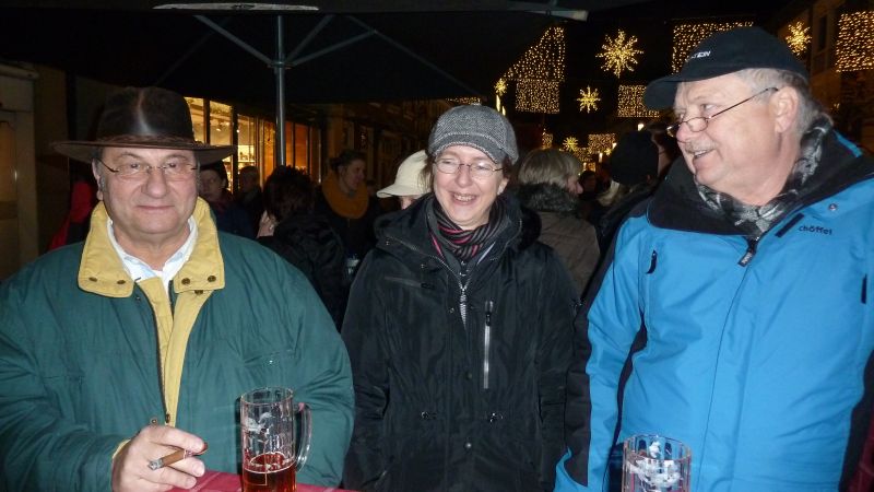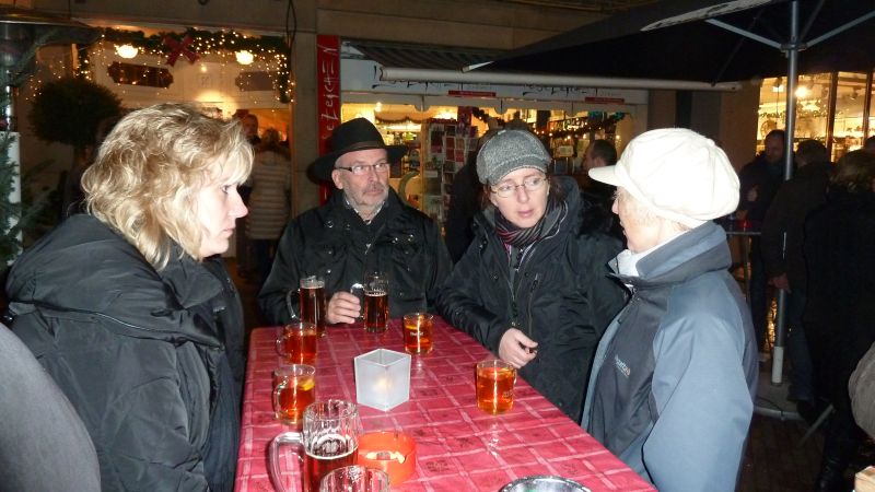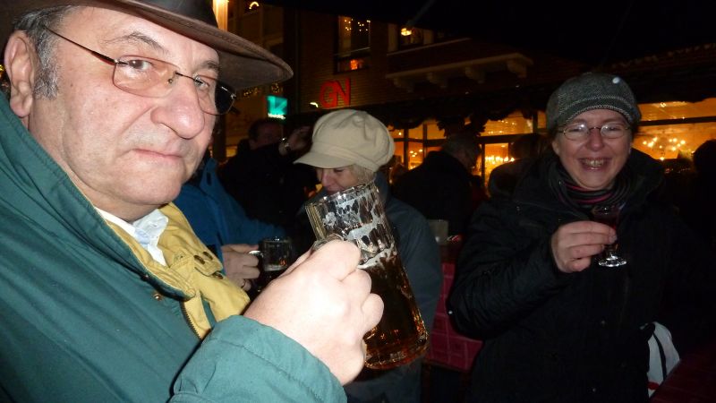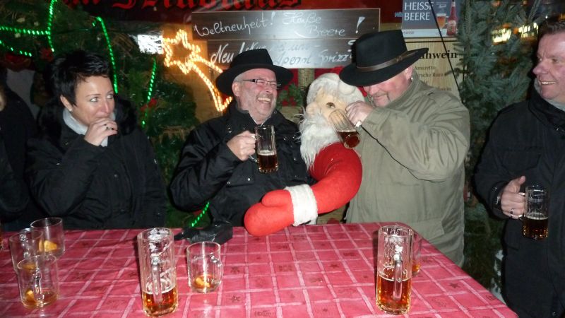 Glühwein, Aperol Sprizz Heiß und Weihnachtsbier waren die beliebtesten Getränke. Für Glühwein hätte es ruhig ein wenig kälter sein können. Irgendwie hatte ich plötzlich den Nikolaus im Arm, der hatte auch soooo Durst. Ich durfte ihn aber nicht mit ins Hotel nehmen (der hätte doch auf dem Ritz schlafen können). Irgendwer hat dann noch mit kleinen Gläschen „Roten“ angefangen, wodurch ein Budenwechsel nicht mehr gelang. Auf dem Weg zurück ins Hotel zeigte uns Dietmar die Kneipe seiner Jugendsünden. Der Wirt hatte im ersten Moment an einen Überfall gedacht.