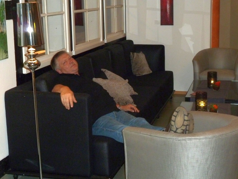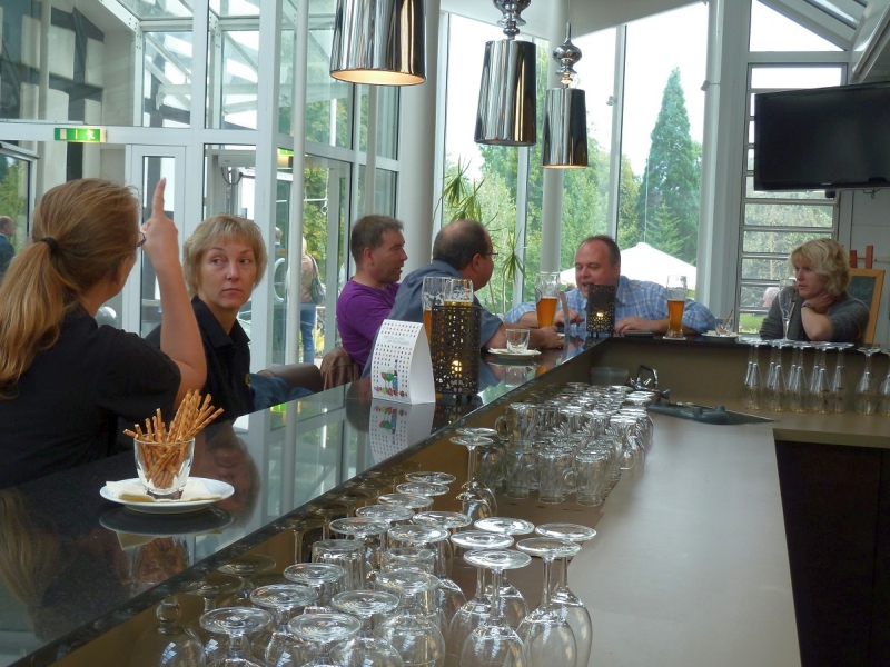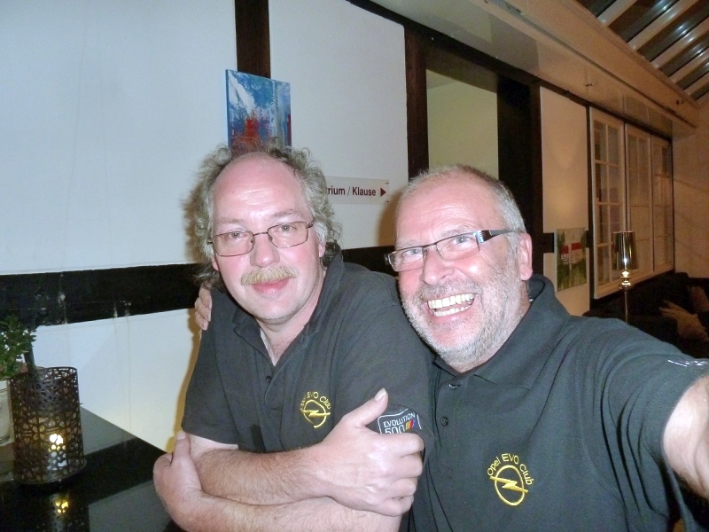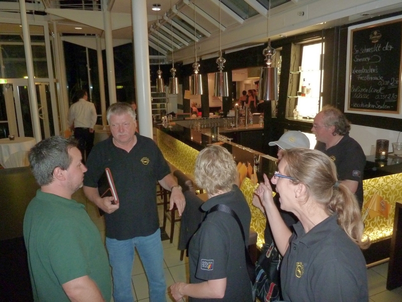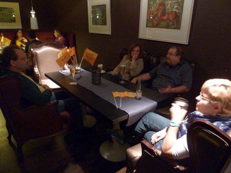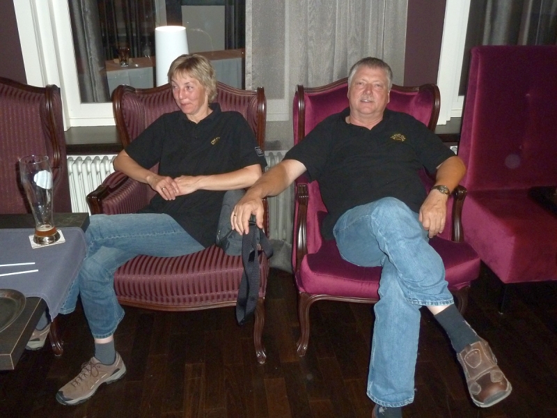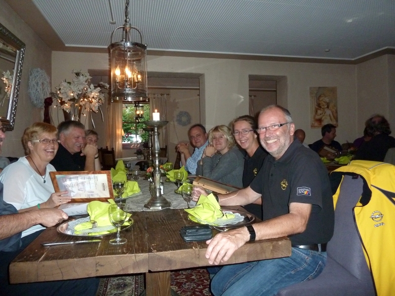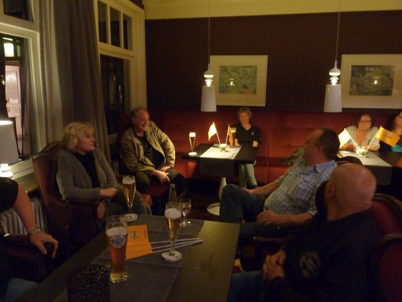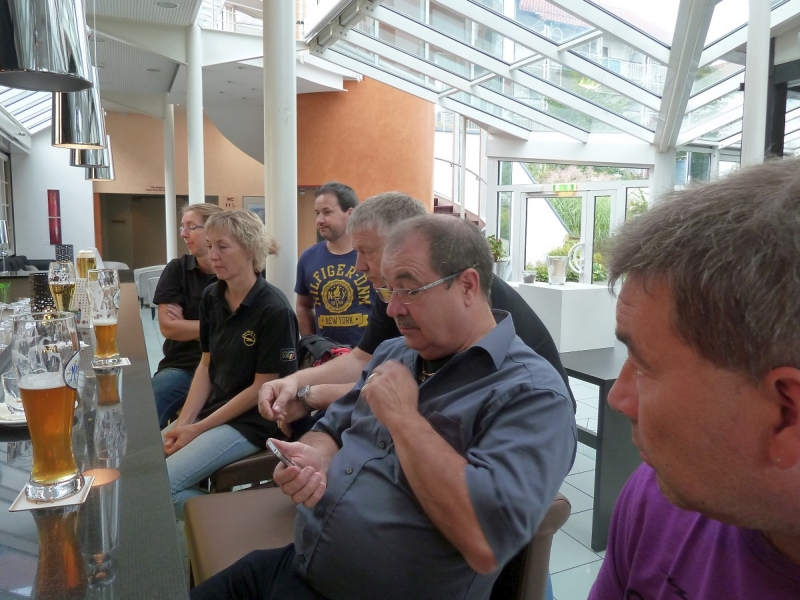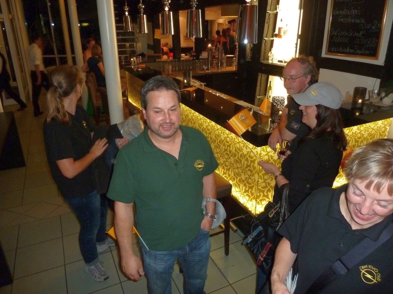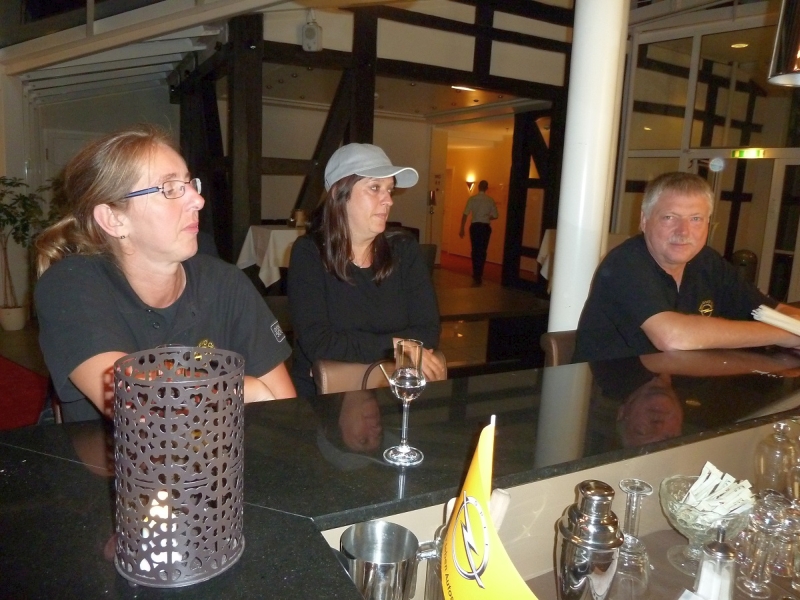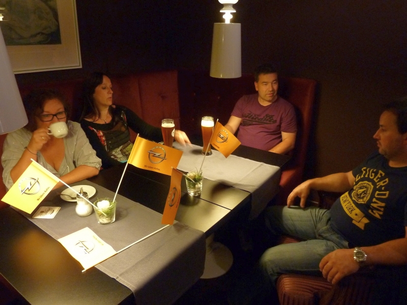 Zurück im Hotel stand uns die Lounge neben der Hotelbar zur Verfügung. Bei kühlem Bier wurde über Gott und die Welt geplaudert. Wolfram und Susanne hatten den Raum mit Opel-Fähnchen dekoriert, damit wir uns alle heimisch fühlten.