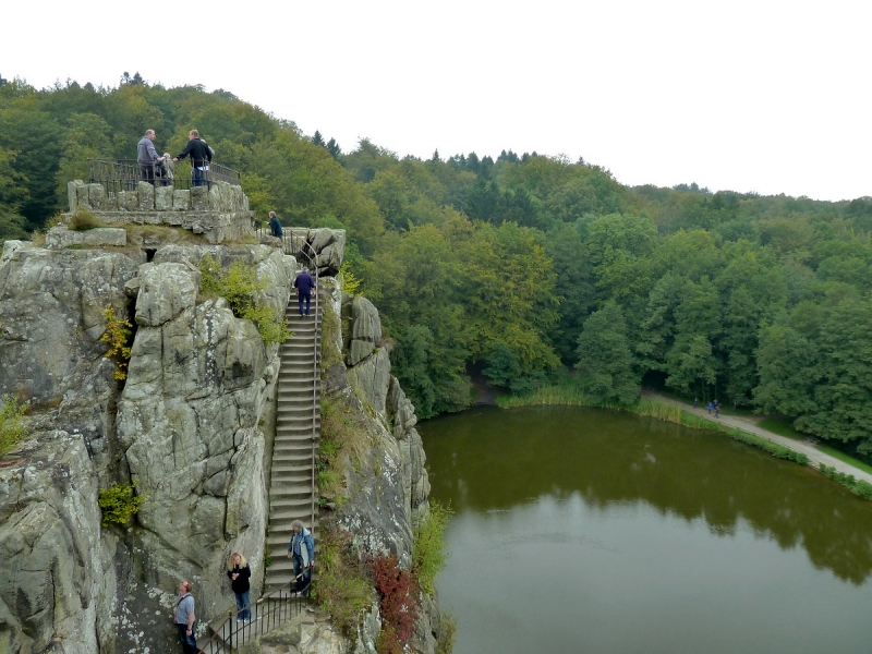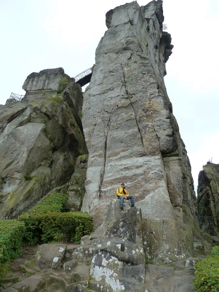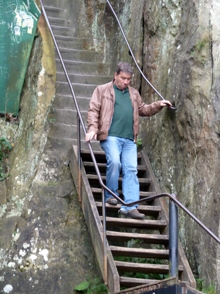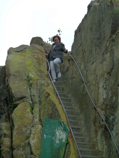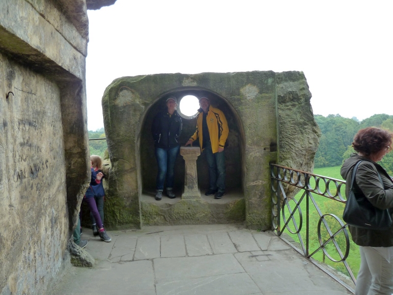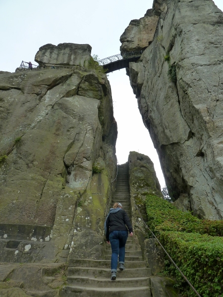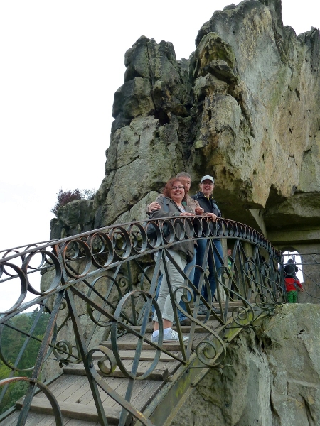 Einige hatten noch die Kraft die Steine zu besteigen. Von oben bot sich ein schöner Ausblick auf die Natur des Teutoburger Waldes. Bernd war ob des Alters der Anlage doch etwas skeptisch, ob die Treppe sein Gewicht halten würde. Die Treppe hielt.