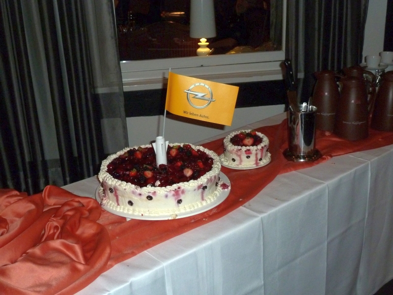Das Organisationsteam war bis jetzt sehr zufrieden und hatte sich gefreut, dass alles geklappt hatte. Dann konnten wir auch um 1:45 Uhr die Opelfahne auf dem Rest der Hochzeitstorte hissen.