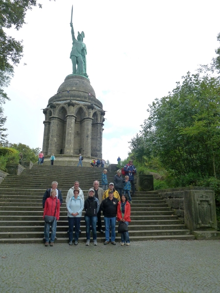 Eine kleine Gruppe besuchte aber noch das „Hermannsdenkmal“ im Teutoburger Wald. Es war der Wunsch des Künstlers und Architekten Ernst von Bandel im 19. Jahrhundert der entstehenden deutschen Nation ein Nationaldenkmal zu schaffen. Dem Cheruskerfürsten Arminius (eingedeutscht Hermann) war es 9 n. Chr. gelungen vier germanische Stämme zu einen und in der Varus-Schlacht die feindlichen Römer zurück zu drängen. Hermann wurde zum Symbol für die Vereinigung deutscher Stämme und die Abwehr äußerer Feinde. Der Förderverein erklärte bei der Grundsteinlegung 1838, man sollte das Denkmal betrachten als ein Mahnmal, fremde Sitten, fremdes Recht und fremde Freiheit zu achten und eigene Sitte, eigenes Recht und eigene Freiheit zu wahren. Das gilt auch heute noch, vielleicht mehr denn je.
