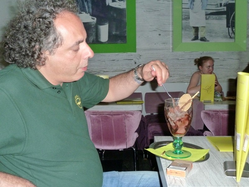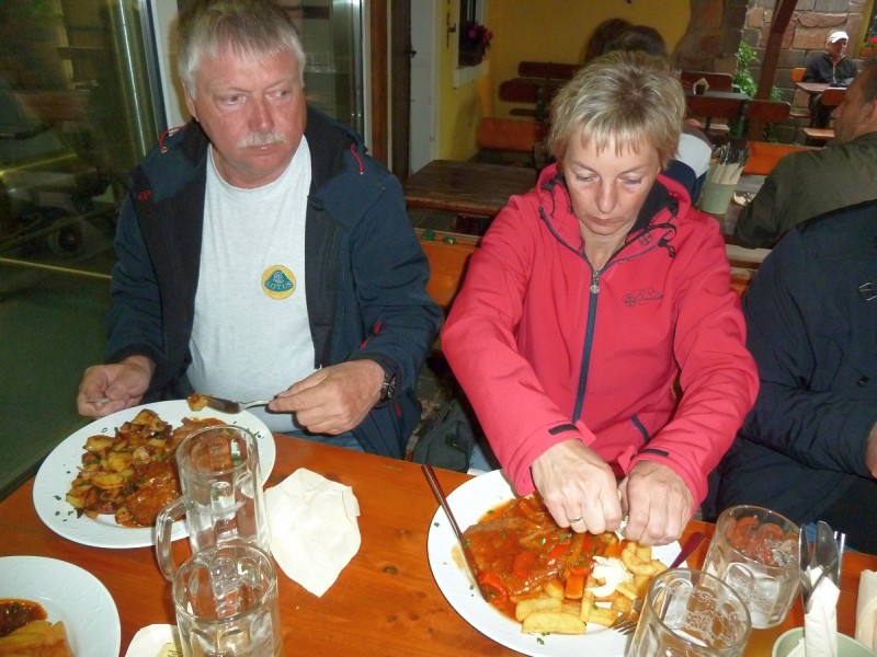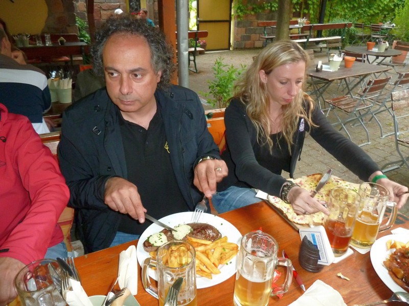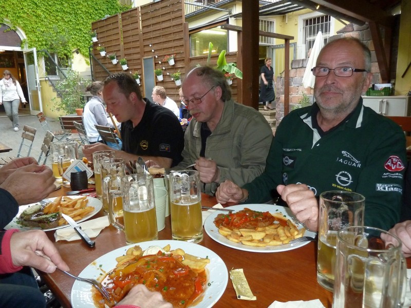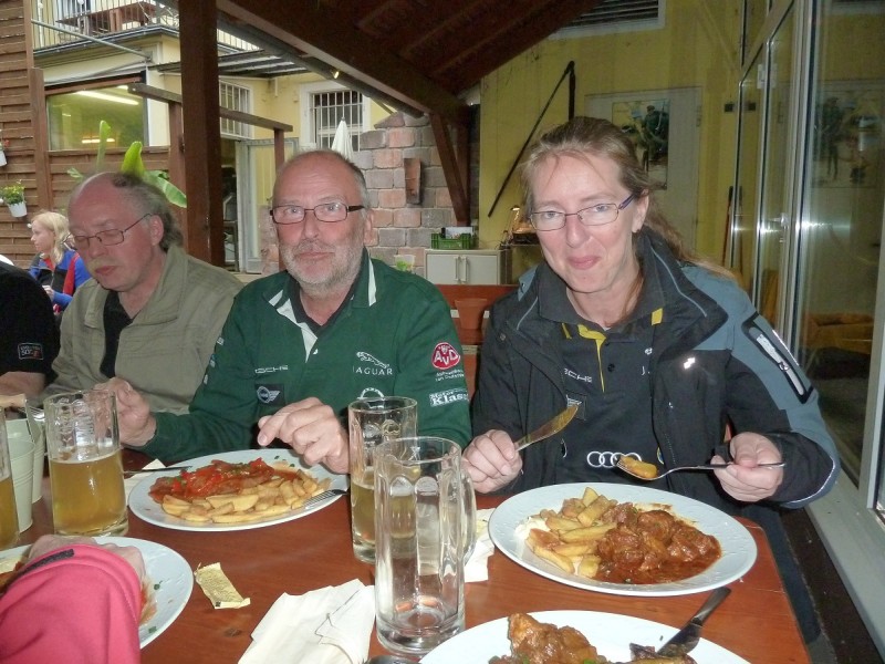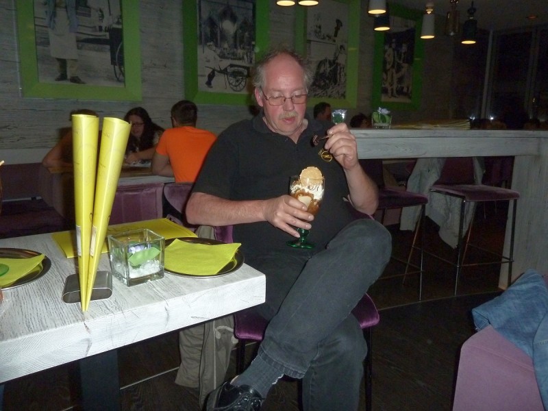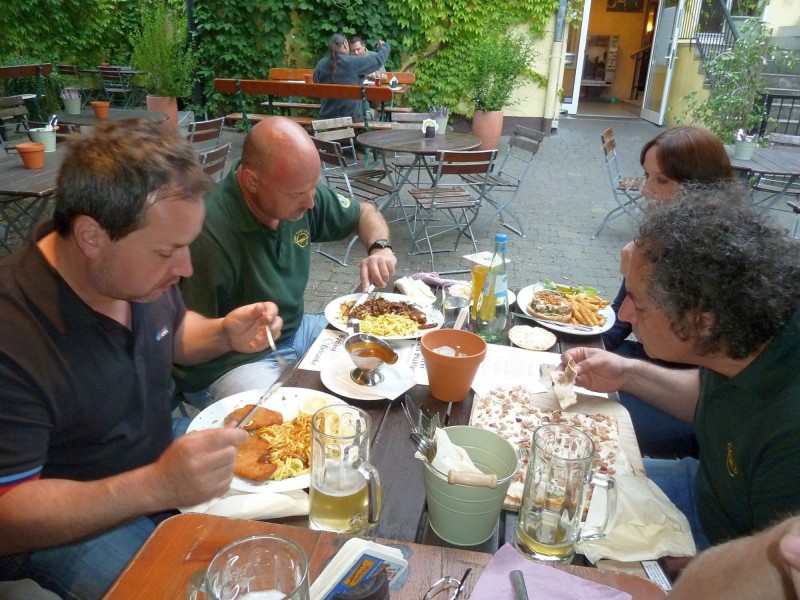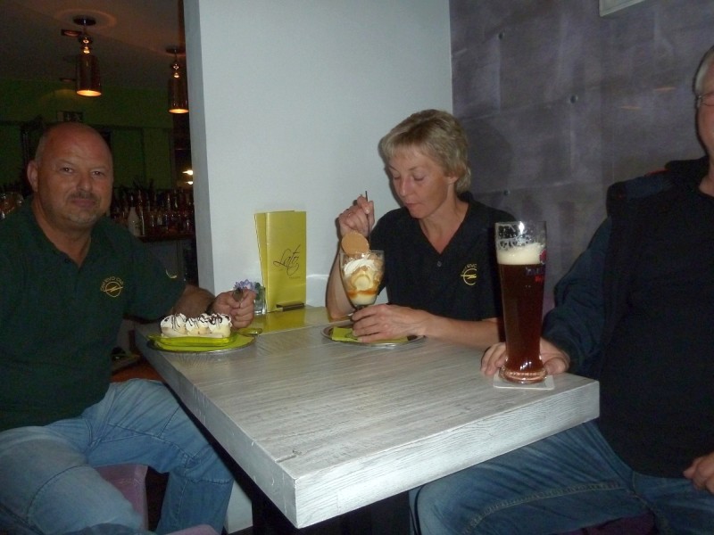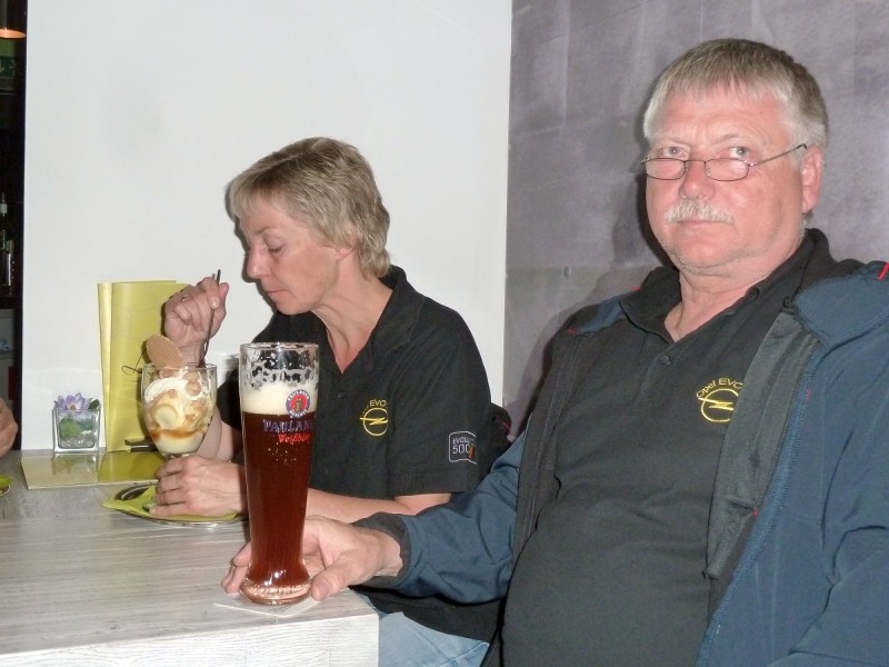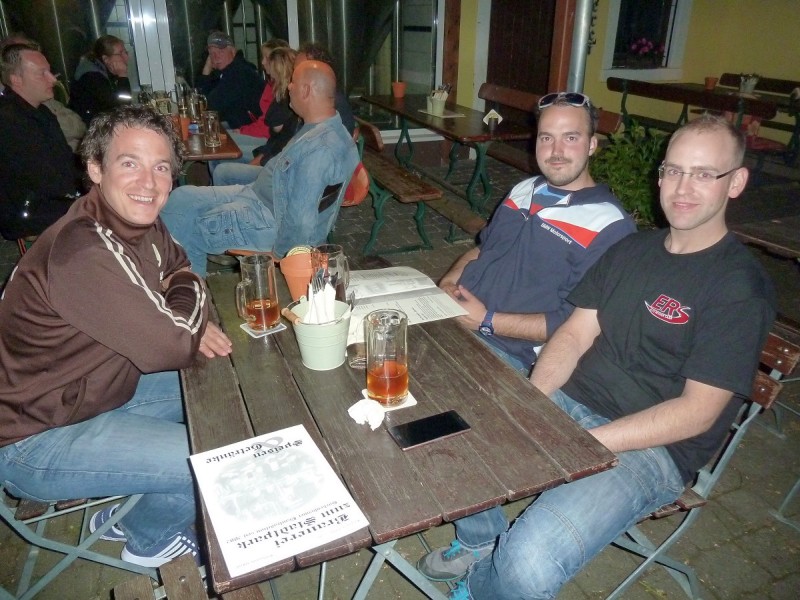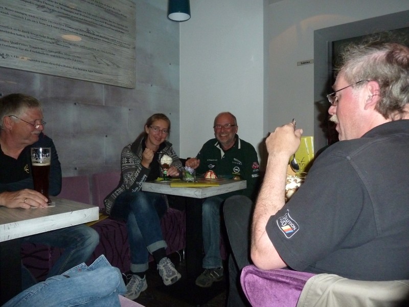 Rennen macht hungrig. Also gingen diejenigen, die nicht noch am Sonntag nach Hause fuhren, wieder ins Brauhaus und führten ihren Körpern neue Energie zu. Gegenüber unserem Hotel „Kanne“ stürmten wir zur vorgerückten Stunde noch in ein Eiscafé, um die Lusterlebnisse des Tages abzurunden. Wolfram blieb beim Nachtanken von Wasser, diesmal gefärbt mit Hopfen und Malz, was bei seinen EVO dann doch nicht verloren war.