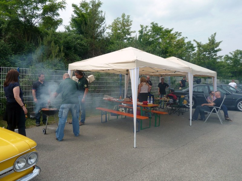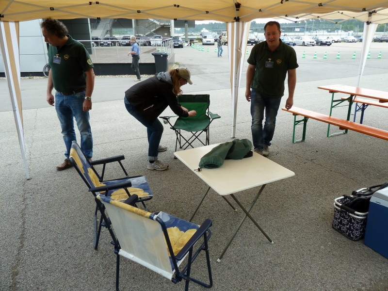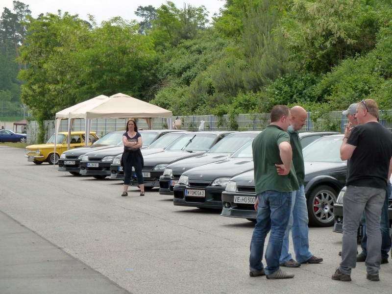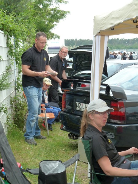 Am Sonntagmorgen fanden wir uns auf dem Hockenheimring auf unserem Stammplatz hinter der Mercedestribüne ein. Der Mercedesclub hatte uns einen Pavillon mit Biergartengarnitur aufgebaut. Wir hatten auch noch einen mitgebracht und so richteten wir uns erstmal häuslich ein, bevor die ersten Runden gedreht wurden. Alles lief gut, wir hatten keine Ausfälle zu verzeichnen. Immerhin mit elf Omegas waren wir angetreten. Nach jeder Ausfahrt wurde natürlich gefachsimpelt, wie es gelaufen war und was man hätte besser machen können und wo Zeit liegengelassen wurde. Eins galt immer, es lag nie am Fahrer.