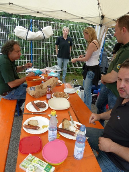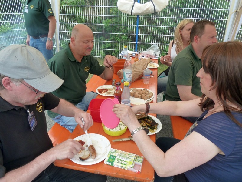 Die Versorgungssituation war sehr gut. Wir waren mit zwei Grillgeräten angerückt und (fast) alle hatten sich zu essen und zu trinken mitgebracht. So gut waren wir noch nie ausgestattet. Man schaute, was die anderen mitgebracht hatten, wo es auch was anderes Leckeres gab oder wo man mitessen konnte, wenn man es selbst vergessen hatte. Zur Hauptstoßzeit wurde am Grill dreihändig gearbeitet. Es war in all den Jahren die schönste und geselligste Mittagspause. Das Wetter spielte auch mit.