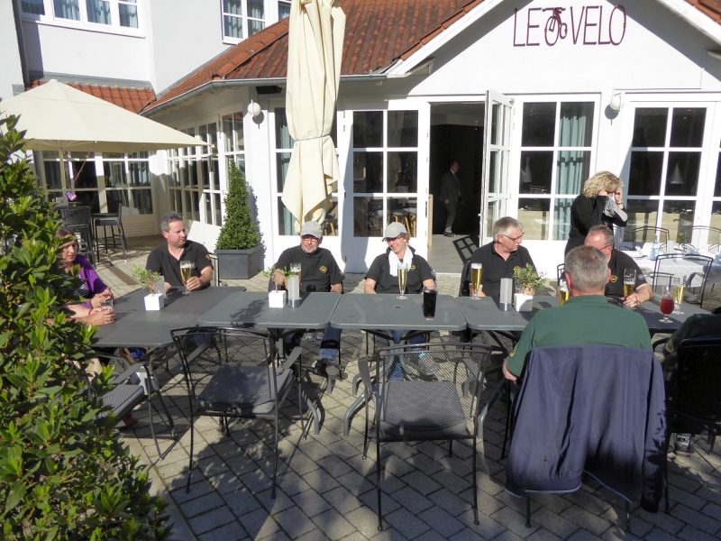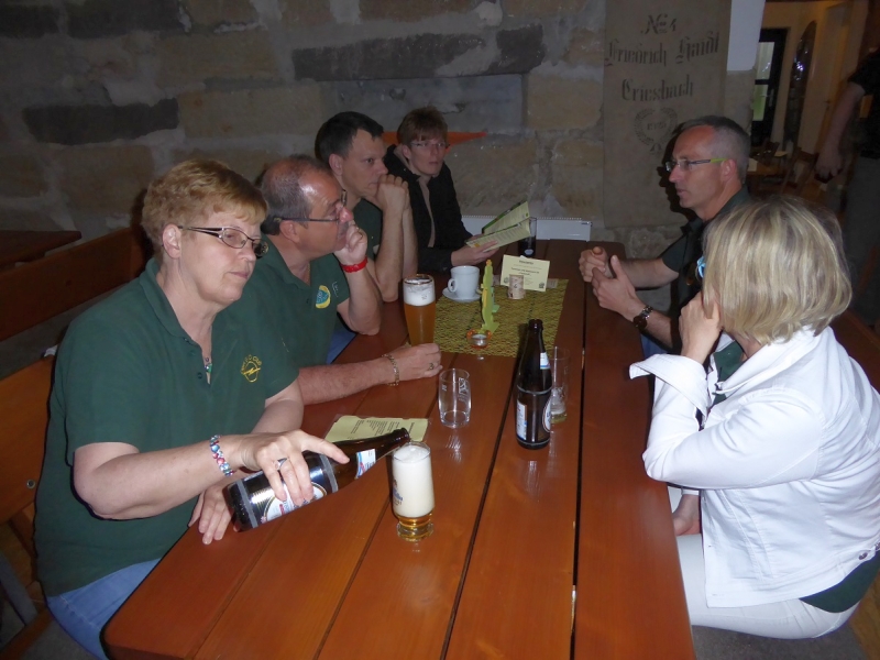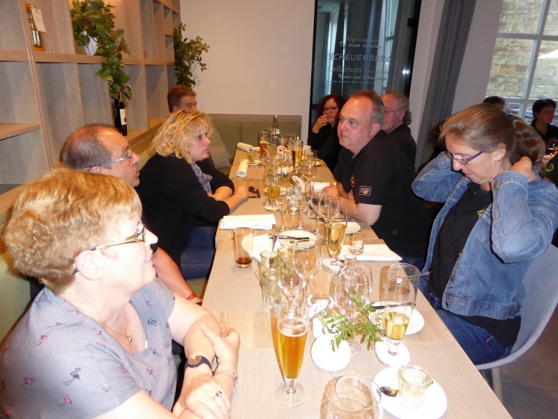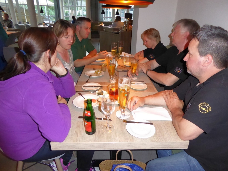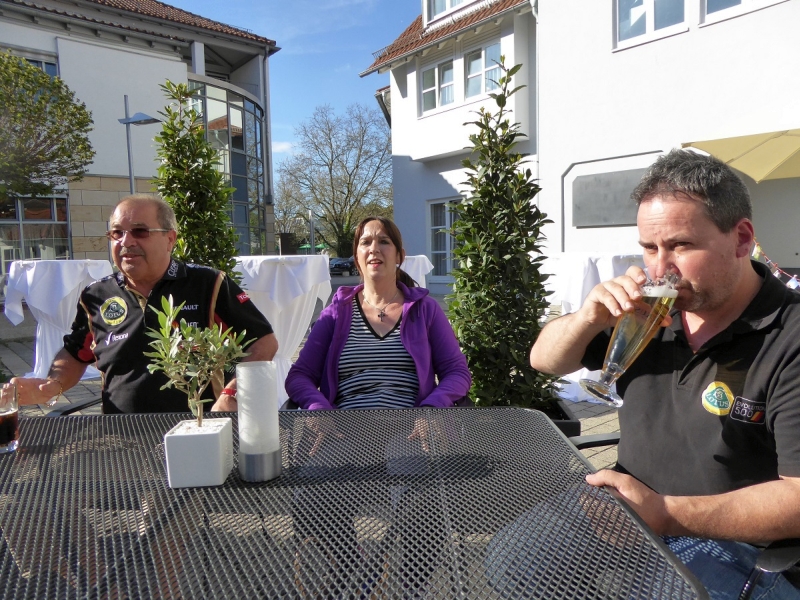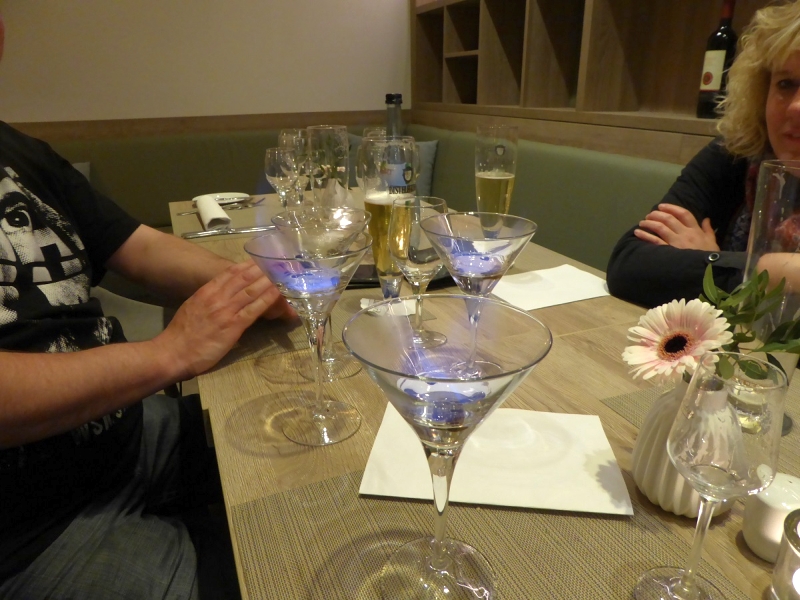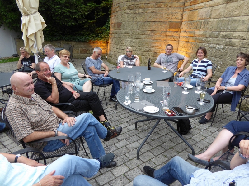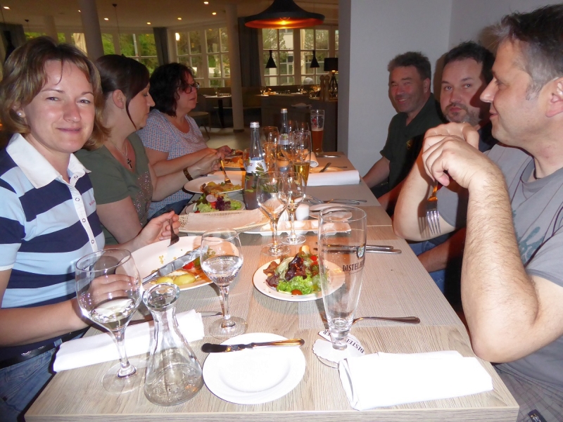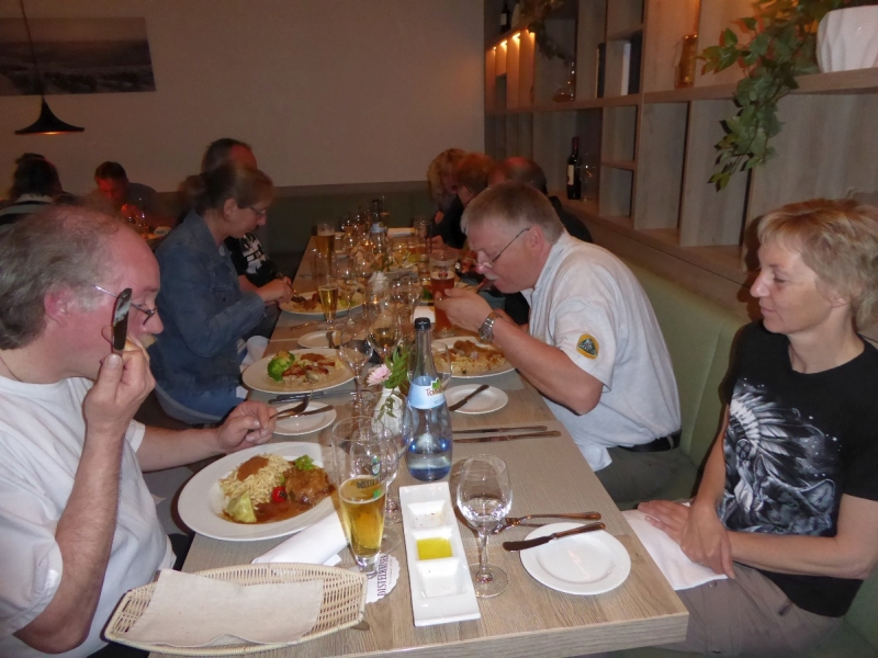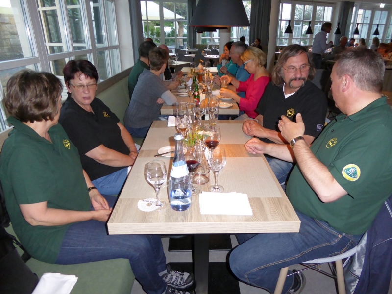 Am Donnerstag, den 18. Mai reisten alle an und nach dem Check-In trafen wir uns auf der Außenterrasse hinter dem Hotel. Endlich sahen wir uns nach einem langen Winter wieder. Das ist immer eine große Freude. An diesem Tag stand nur das gemeinsame Abendessen im Hotel auf dem Programm. Und dass so eine Anfahrt durstig macht versteht sich von selbst. Also wurde schon das ein oder andere Feuerchen angemacht