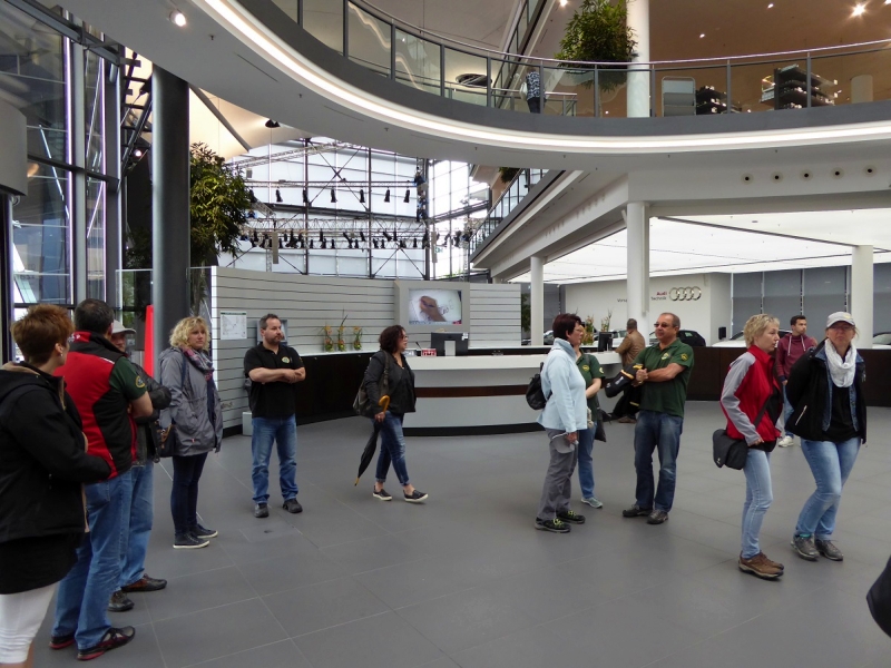 Die zweistündige Führung war eine Reise ins Herz von Audi. Die Besichtigung begann im Presswerk, wo alle Karosserieteile entstehen, die anschließend von ca. 1.600 Robotern zur fertigen Karosse aus Stahl und Aluminium zusammengefügt werden. Faszinierend dabei ist, dass unterschiedliche Modelle direkt hintereinander gebaut werden. Der Weg führt weiter in die Montage. Eine präzise Logistik stellt für jedes Fahrzeug an jedem Montageplatz die passenden Komponenten für innen und außen zur Verfügung. Höhepunkt ist die Hochzeit von Karosserie und Antriebsstrang. Leider durften wir während der Führung keine Fotos machen.