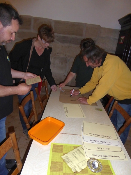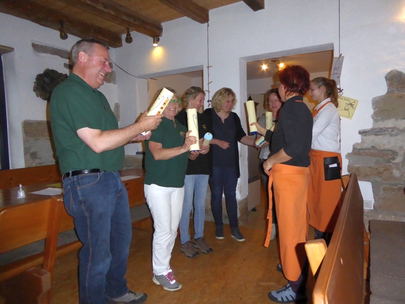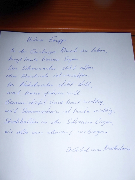 Für Dichter und Denker war auch etwas dabei. Mit vorgegebenen Begriffen musste ein Reim geschrieben werden. Nachfolgend mein geistiger Erguss für die Gruppe “Verrückte Hühner“: