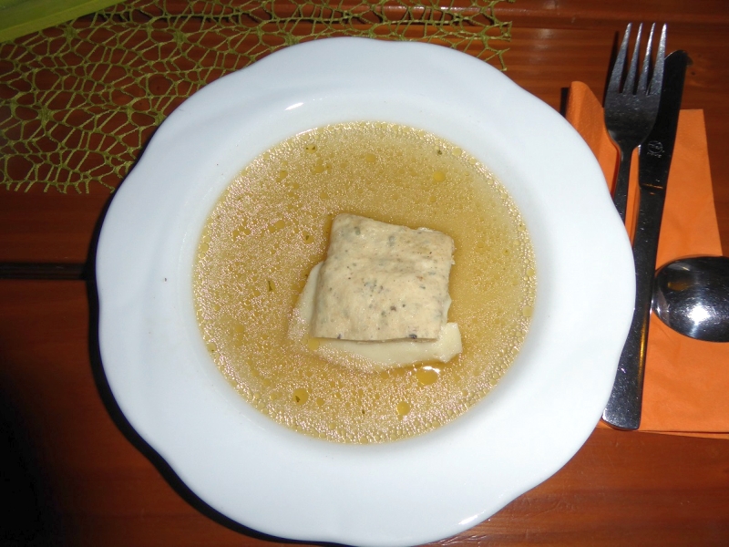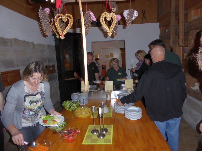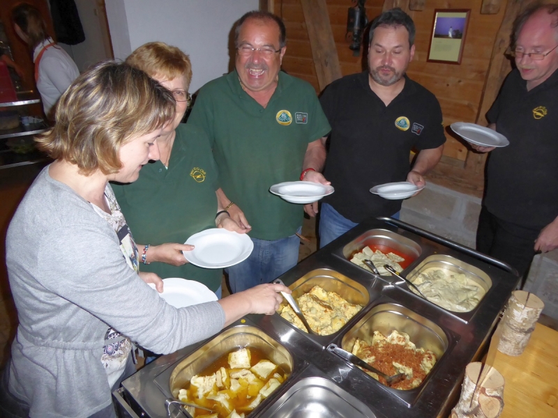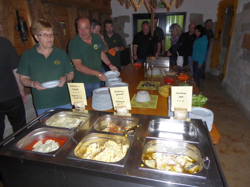 Um 19:30 Uhr wurde das Maultaschenbuffet eröffnet. Maultaschen sind eine Spezialität der schwäbischen Küche und bestehen aus Nudelteig mit einer Füllung aus Brät, Zwiebeln und eingeweichten Brötchen. Es gab Maultaschen in allen Variationen. Geschmälzt, das heißt mit in gebräunter Butter angebratenen Zwiebeln übergossen, oder in einer Suppenbrühe, mit Ei überbacken oder holländische oder italienische Art. Dazu wurde ein Salatbuffet gereicht.