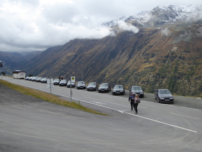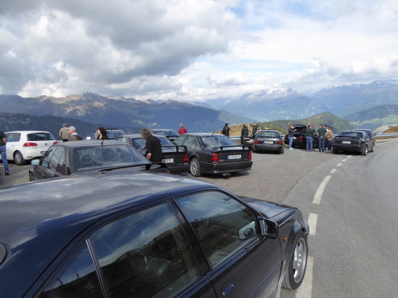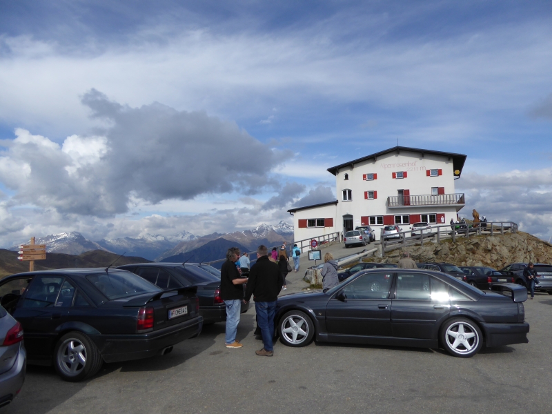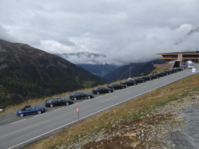 Am Sonntag, den 24.September ging es nach dem Frühstück los. In einer Kolonne von 15 Autos überquerten wir den Fernpass (1.215 m) mit kurzer Pause am Zugspitzblick, fuhren durch das Ötztal und nahmen dann das Timmelsjoch (2.474 m) unter die Räder. An der Mautstation machten wir im Restaurant „Mountain Crosspoint“ Mittagspause. Unsere Autos, sauber aufgereiht, gaben vor der Kulisse ein beeindruckendes Bild ab.