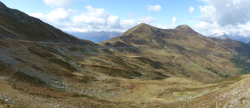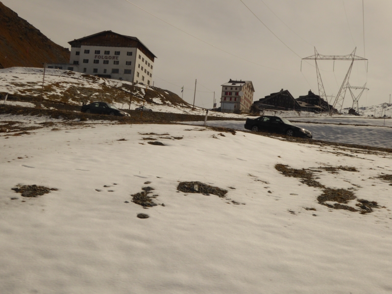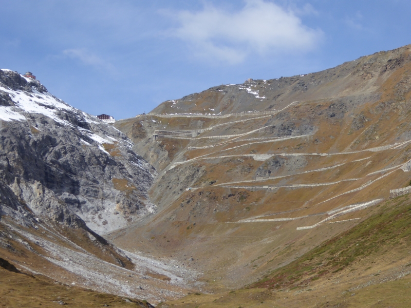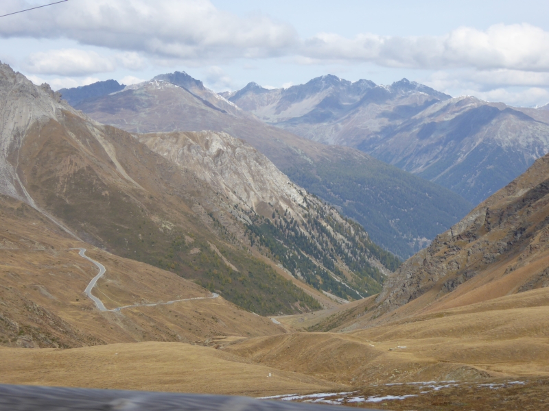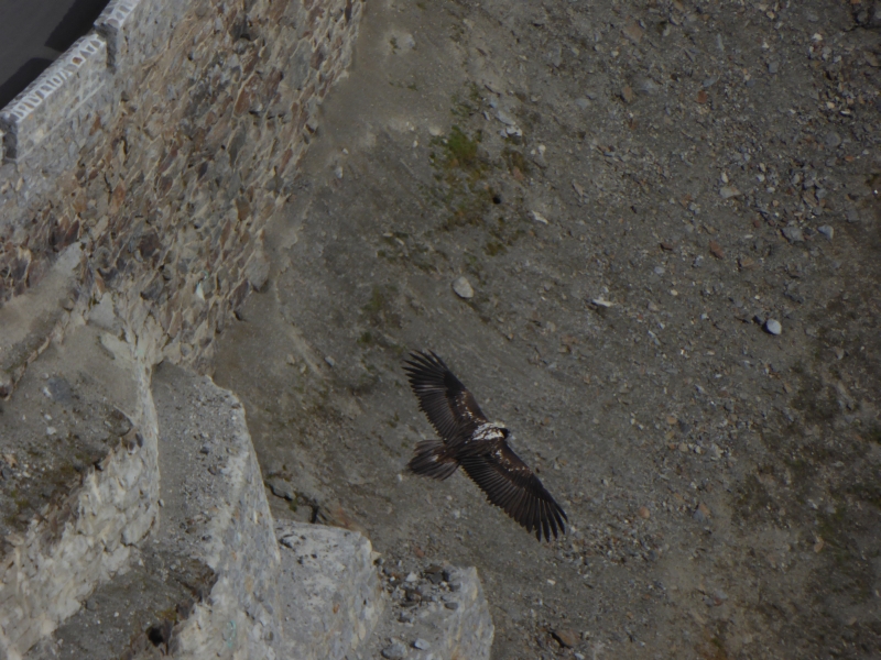 Von der Terrasse bot sich ein gigantischer Blick auf die teils schneebedeckten Berge der Umgebung, auf die tollkühne Passstraße bis hinunter ins Tal und auf die eigentliche Passhöhe. Unterhalb der Terrasse zeigte uns ein Greifvogel die leichte Art sich in den Bergen zu bewegen.