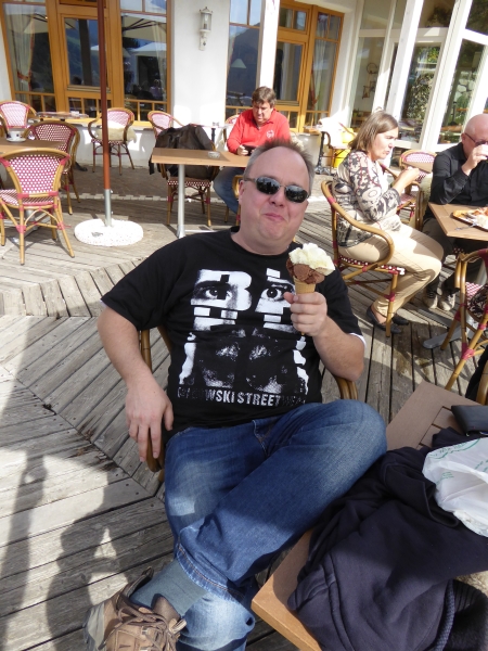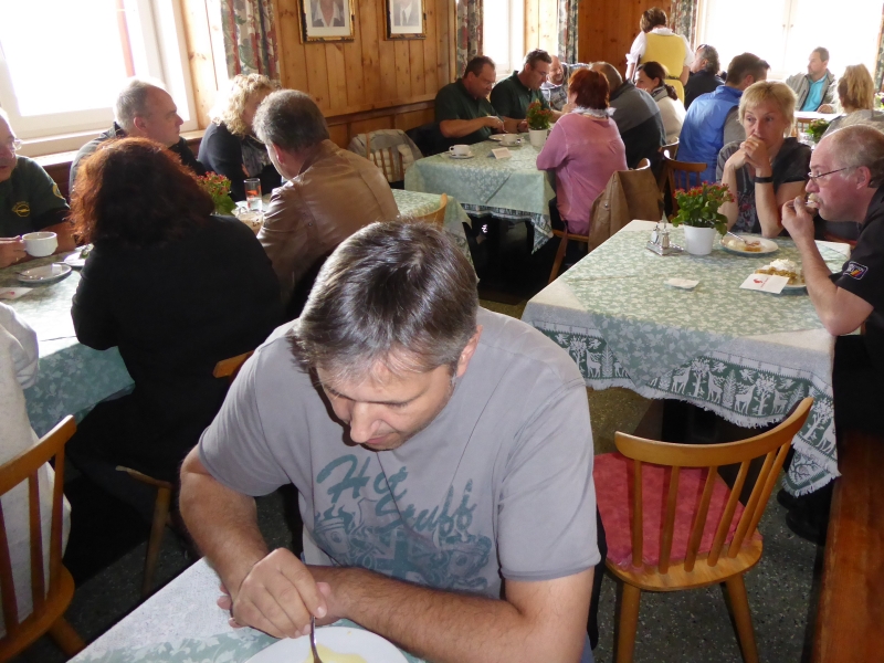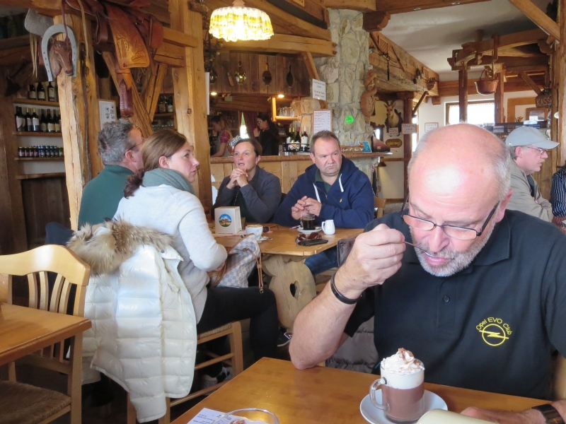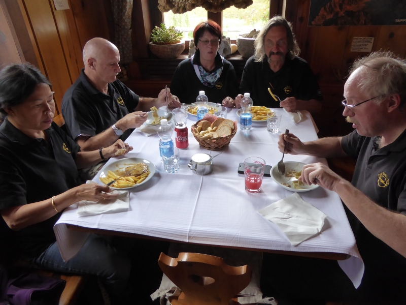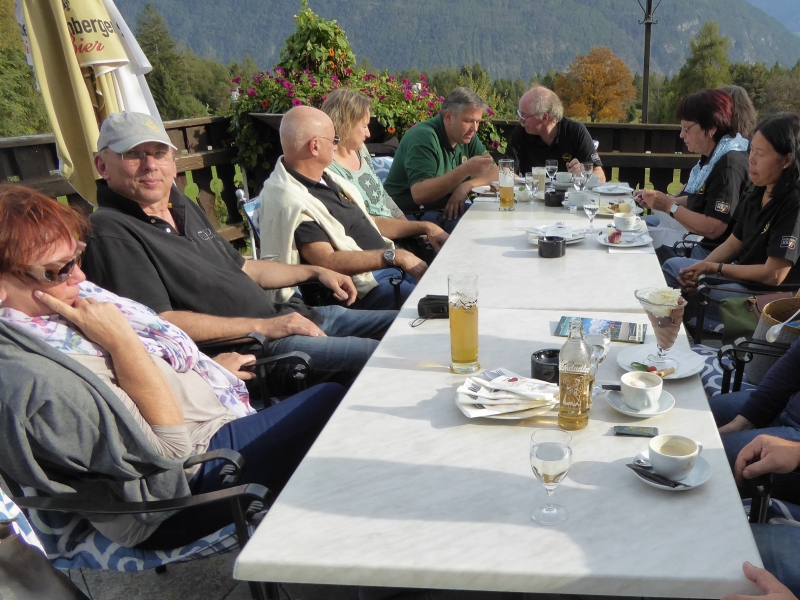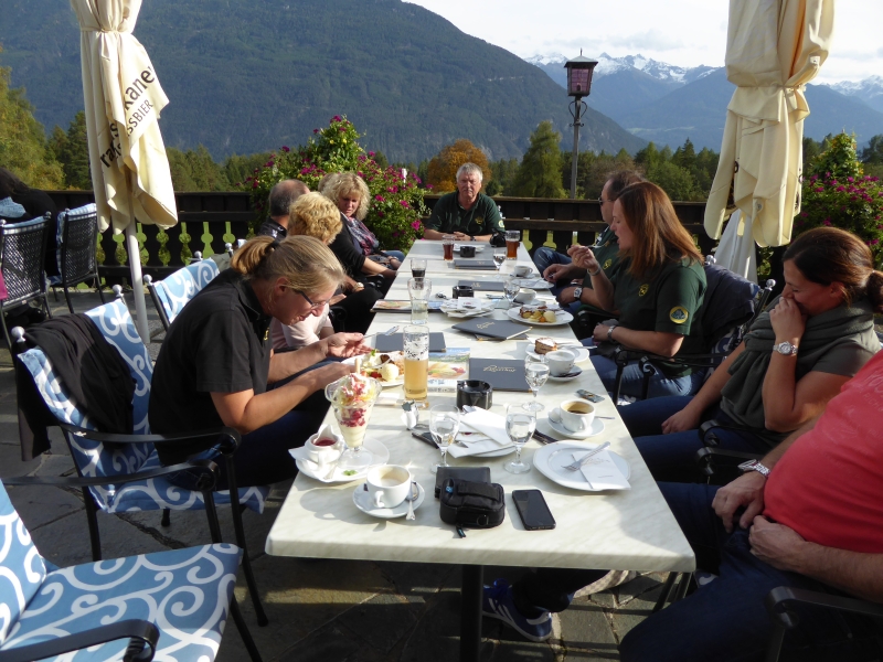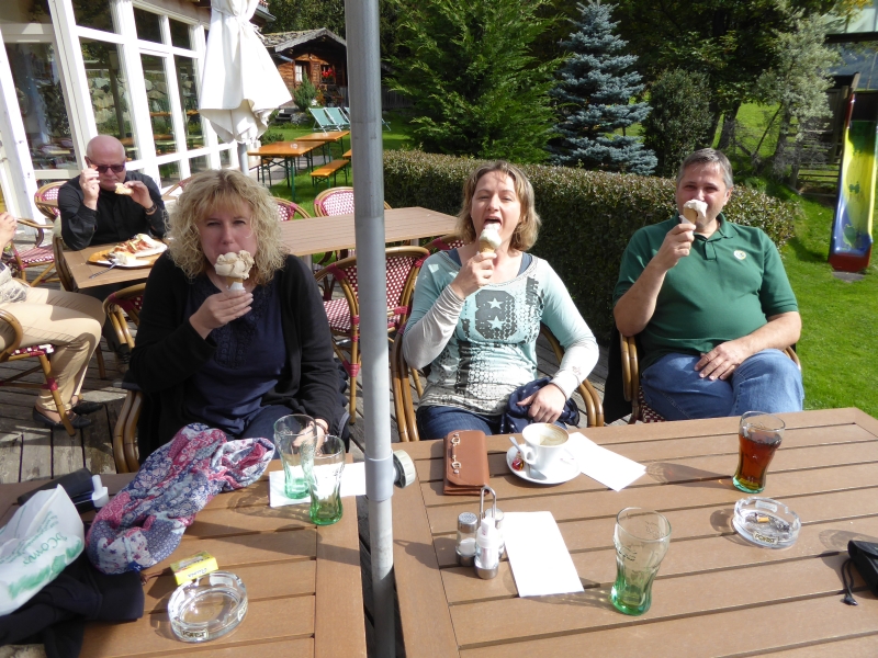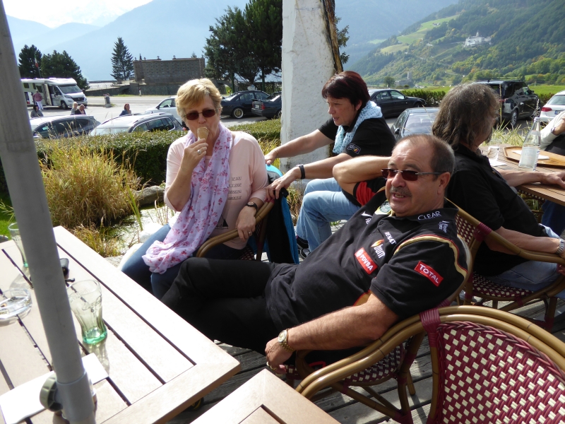 Im Restaurant Haidepark trafen sich beide Gruppen und machten dort eine genüssliche Pause. Dicke Portionen Eis waren der Renner. Es gab viel zu erzählen: Über unzählige Kehren, große Höhen, Raubvögel, Überhitzung, Höhenkrankheit, Wiederbelebung usw.