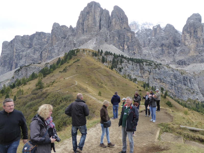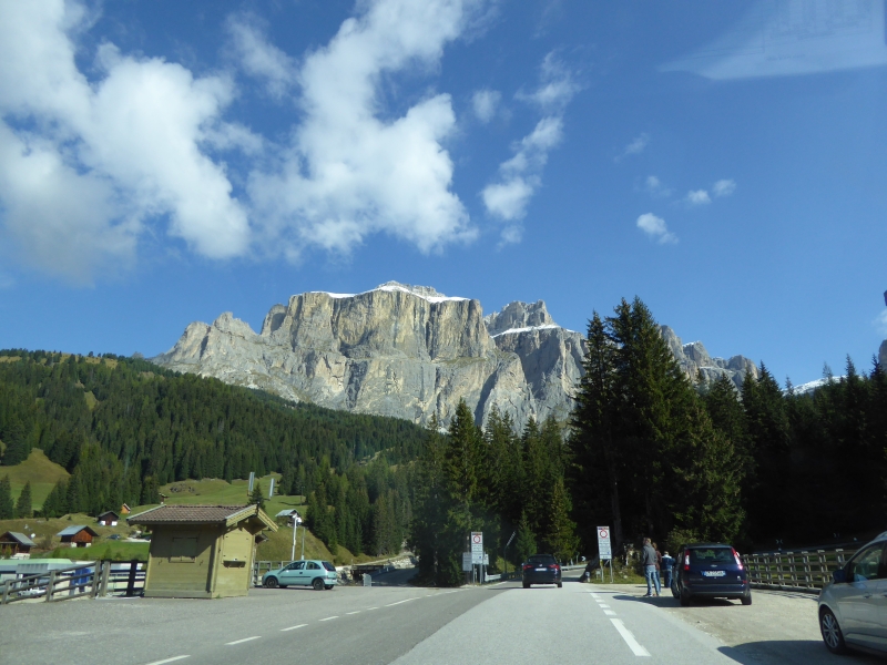 Durch die Urlaubsorte Covara und Colfosco führte die Fahrt aufs Grödner Joch (2.121 m). Hier bot sich ein toller Blick nach Osten, wo wir hergekommen waren, auf die Nordseite des Sella-Massives und nach Westen auf den Langkofel.
