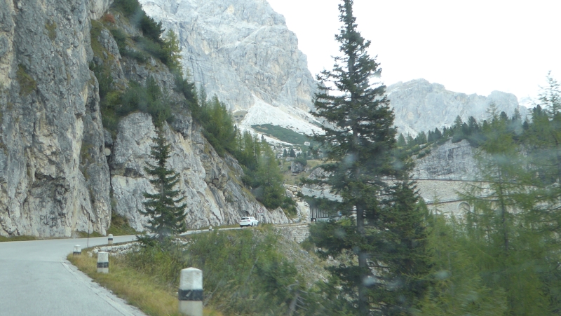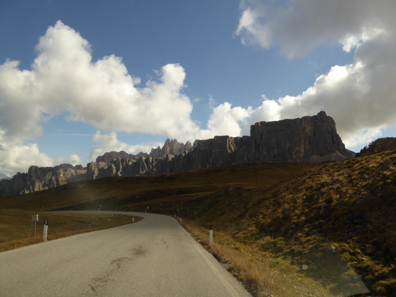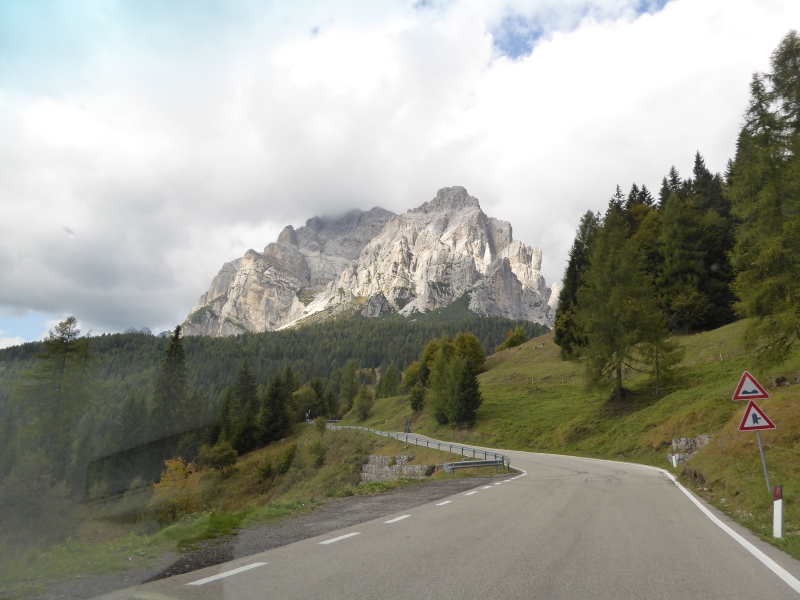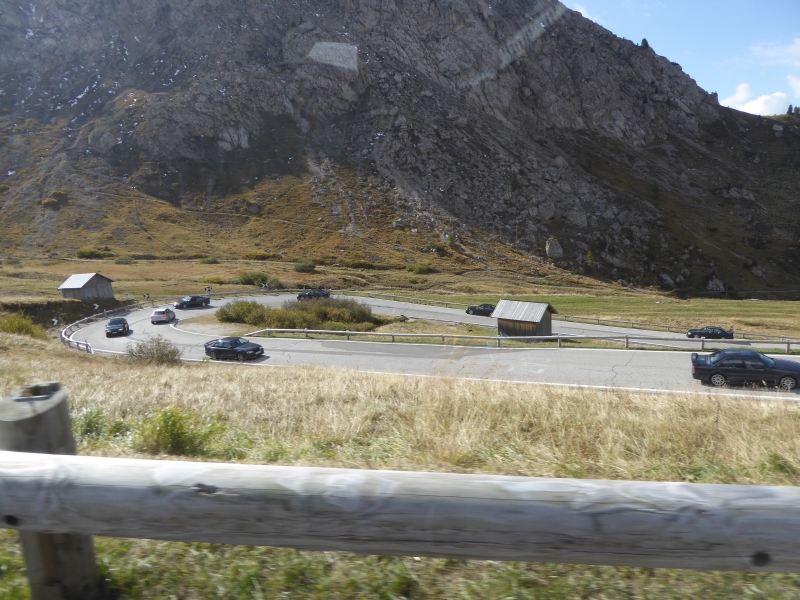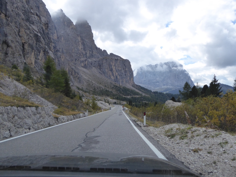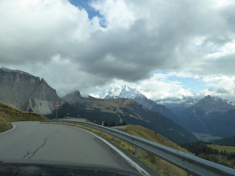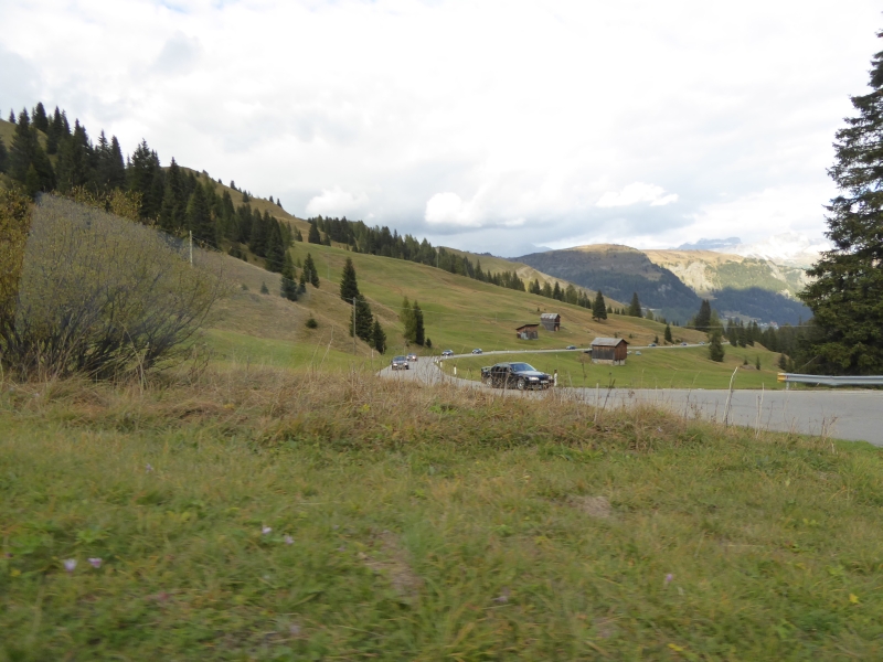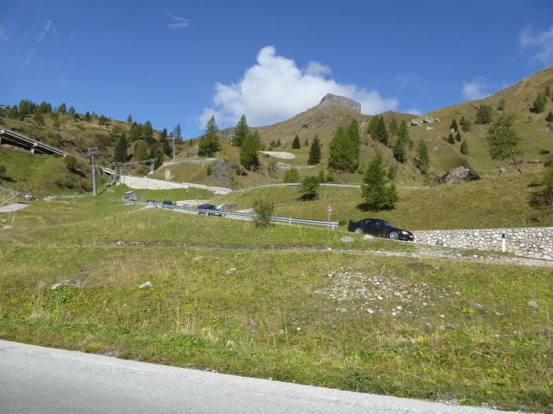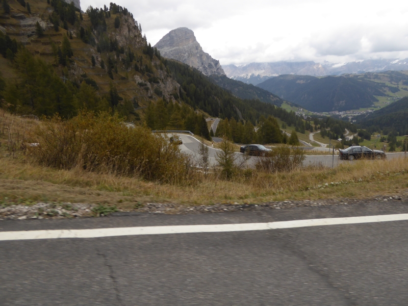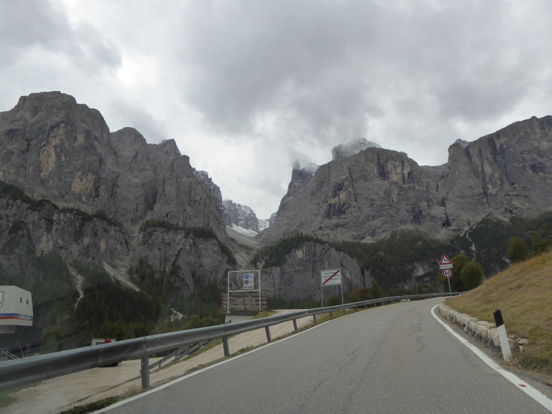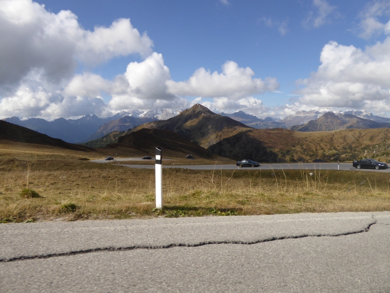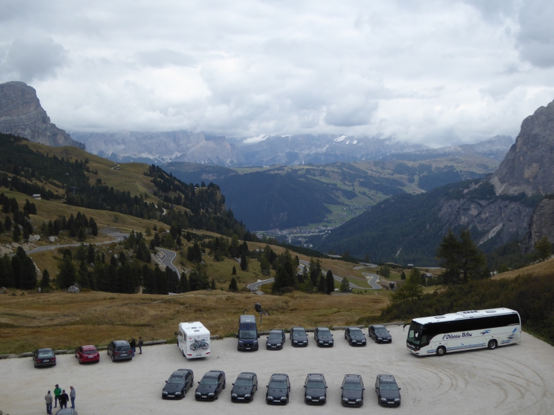 Wir kamen aber wieder heil unten am Parkplatz an und fuhren weiter Richtung Osten durch Arabba und Livine und bogen ab zur Auffahrt auf den Passo Falzarego (2.105 m). Am oberen Ende der Südrampe war der Straßenbau nur mit Hilfe von riesigen Stützmauern möglich. An der Passhöhe hielten wir uns links und nahmen den Passo Valparola (2.192 m) in Angriff. Hier oben machten wir eine kurze Pause, um die Aussicht zu genießen. Wir schauten hinunter ins Gardertal, in dessen südliche Region der bekannte Tourismusverband „Alta Badia“ beheimatet ist.