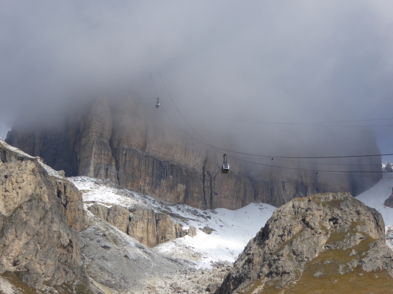Zum Greifen nahe ist der Piz Boè, mit 3.152 m Höhe der höchste Gipfel in der Sella - Gruppe. Leider hatten die Wolken an diesem Tag nur teilweise freie Sicht erlaubt. Aber wir konnten einen Eindruck gewinnen, wie traumhaft hier bei besserem Wetter der Rundumblick sein kann. Nicht vorstellbar, das Seil hätte unser Gewicht nicht gehalten: Die Zahl der Clubmitglieder hätte sich schlagartig stark reduziert, der Gebrauchtwagenmarkt wäre mit heißen Omegas überschwemmt worden, ……………