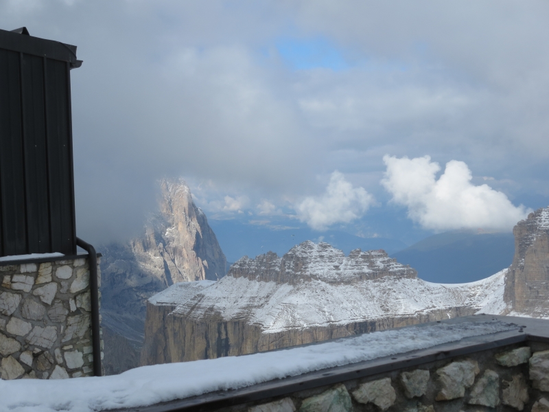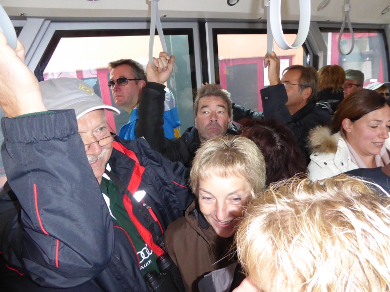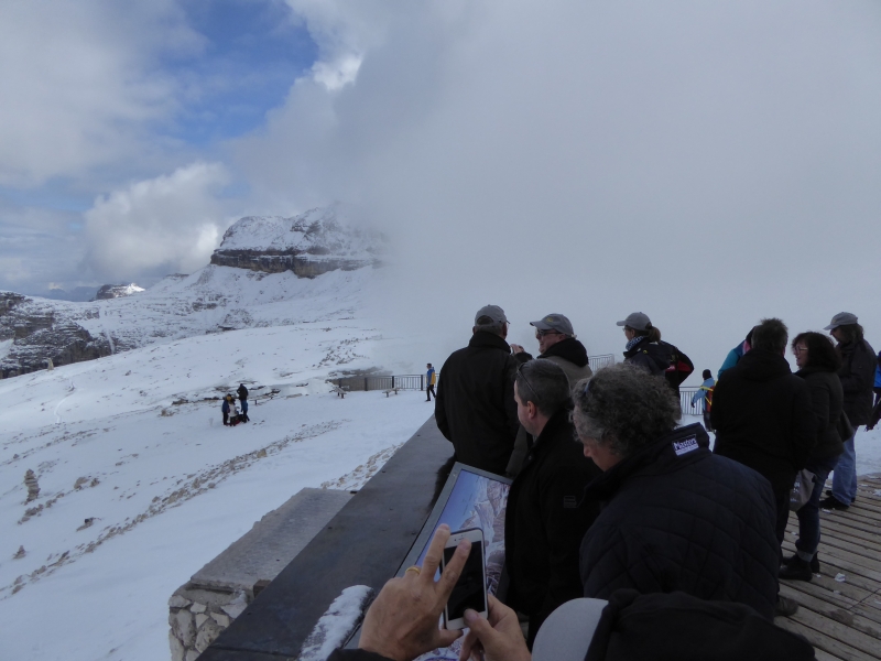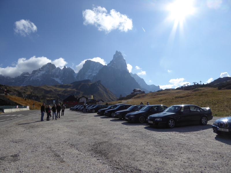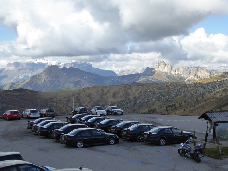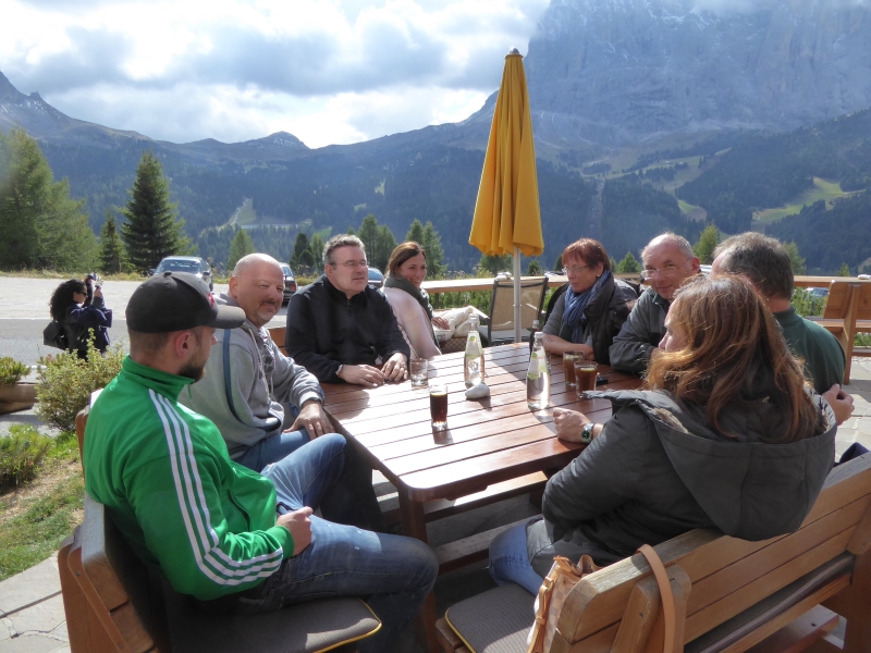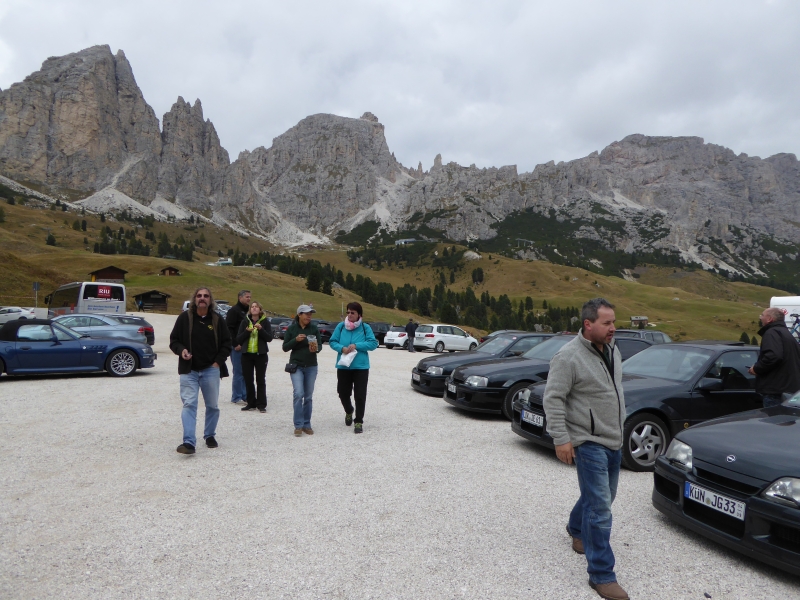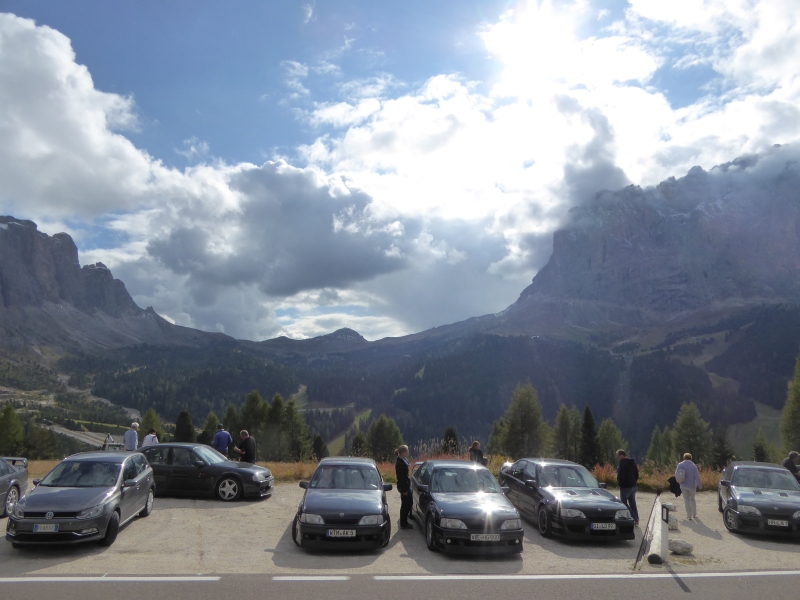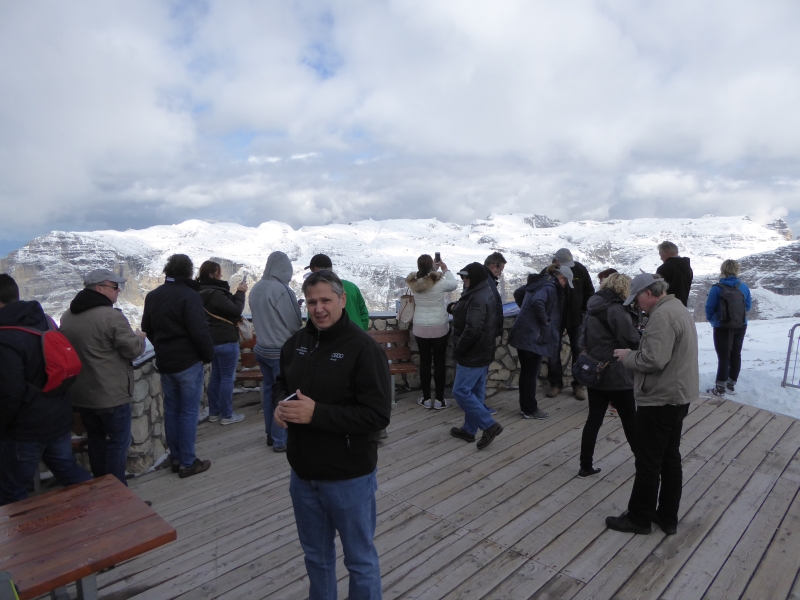 Am Montag, den 25. September stand der Klassiker, die große Sellarunde auf dem Programm. Vom Hotel starteten wir nach Osten über den Karerpass (1.745 m) hinunter ins Fassa-Tal. Von dort fuhren wir Richtung Norden direkt auf das Sellamassiv zu. In Canazei begann dann der Anstieg hinauf auf den Passo Pordoi (2.239 m). Auf der Passhöhe wechselten wir das Transportmittel. Mit der großen Gondel-Seilbahn (ohne Zwischenpfeiler!) ging es hinauf zur Panoramaterrasse Delle Dolomiti in 2.950 m Höhe. Noch nie war unser Club dem Himmel so nah – vielleicht der ein oder andere auf dem Hockenheimring oder der Nordschleife