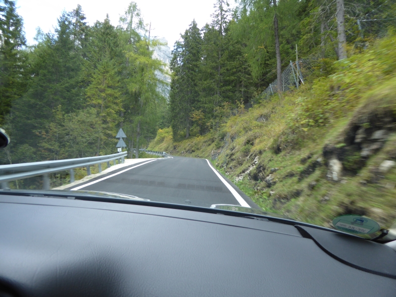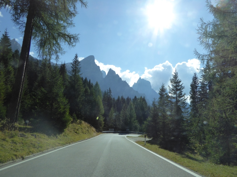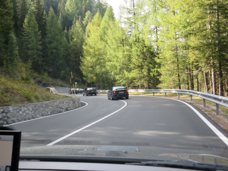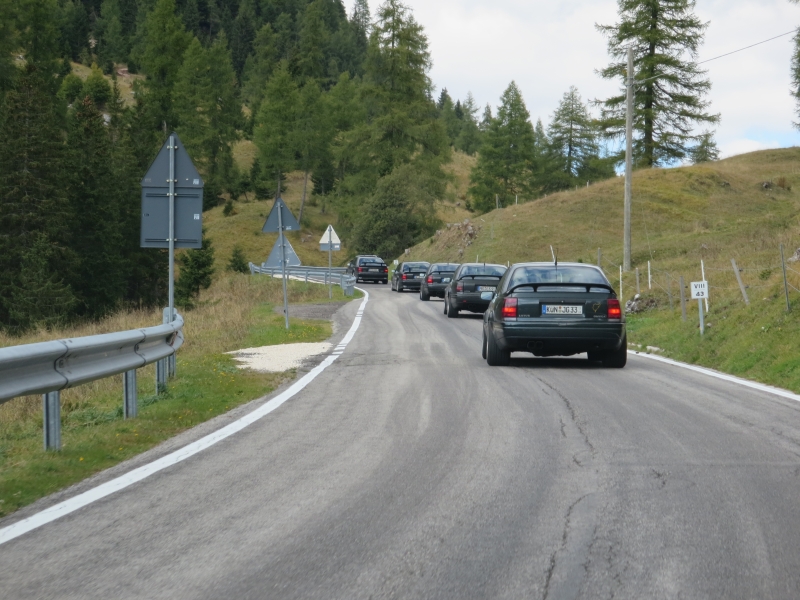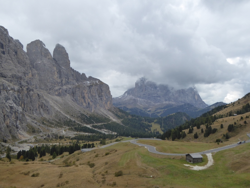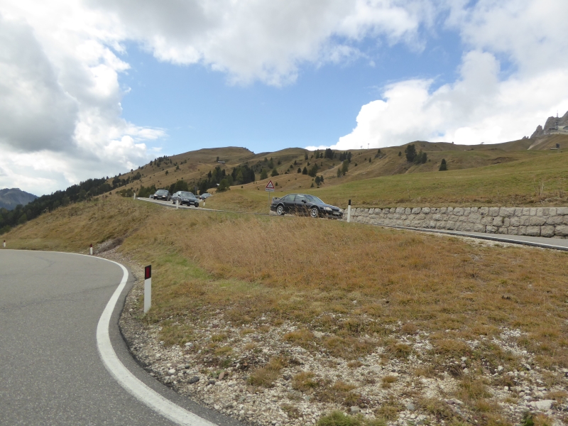 Also machten wir uns nach der Stärkung auf den Rückweg. Zunächst nach Norden bis Schluderbach und dort links über die Strada di Alemagna zunächst nach Westen und dann nach Süden wieder bis Cortina d´ Ampezzo. Hier ging die Fahrt durch viel Wald mit ungewohnt wenig Kurven, schon fast langweilig. Das sollte sich aber wieder ändern. In Cortina hieß es dann abbiegen Richtung Westen und Anstieg aus jetzt östlicher Richtung auf den Passo Falzarego (2.105 m). Hier waren wir schon am Vortag. Diesmal ging die Fahrt von der Passhöhe aber in entgegengesetzter Richtung bergab nach Süden und weiter nach Westen bis Arabba. Keine Zeit zum Verschnaufen, denn es ging wieder bergauf zum Passo Pordoi (2.239 m).