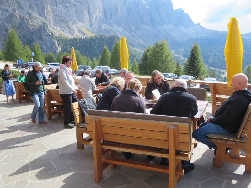 Der weitere Weg führte uns hinab vom Grödner Joch an den steilen Felsen des Sella Massives vorbei Richtung Westen. Nach so viel Kurven hatten wir uns eine Pause mit Kaffee und Kuchen verdient. Dazu bot das Chalet Gerad „The Mountain Lodge“ beste Voraussetzungen mit einem herrlichen Blick auf die Berge des Grödnertals und auf das Sella Joch.