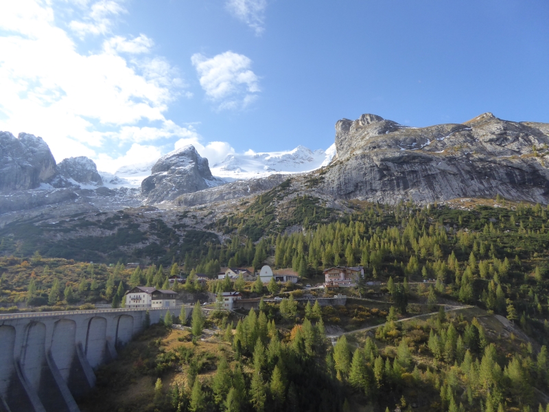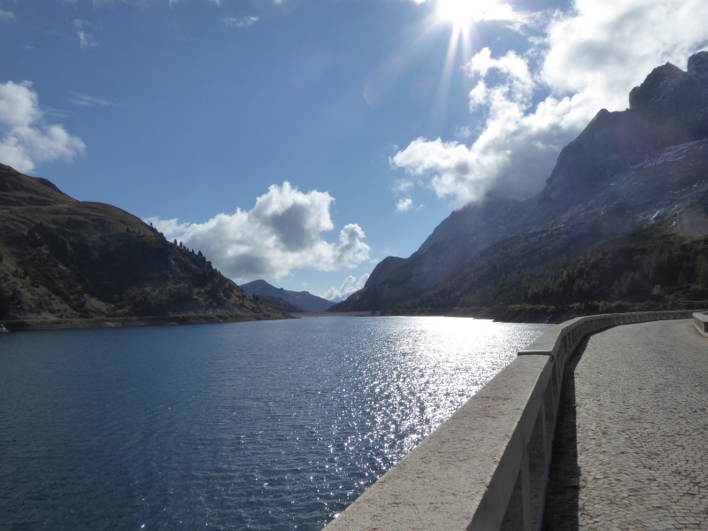 Die Marmolada ist der höchste Berg der Dolomiten und im Prinzip ein lang gestreckter Bergrücken in west - östlicher Ausrichtung. Die höchste Erhebung ist der Punta Penia mit einer Höhe von 3.343 m. Von der Staumauer aus konnten wir auf den Nordhang mit dem größten Gletscher der Dolomiten schauen.