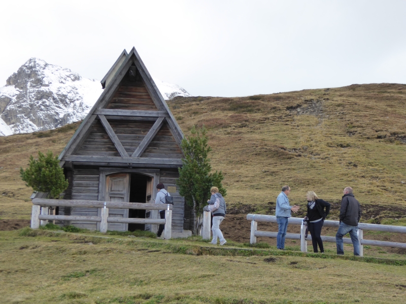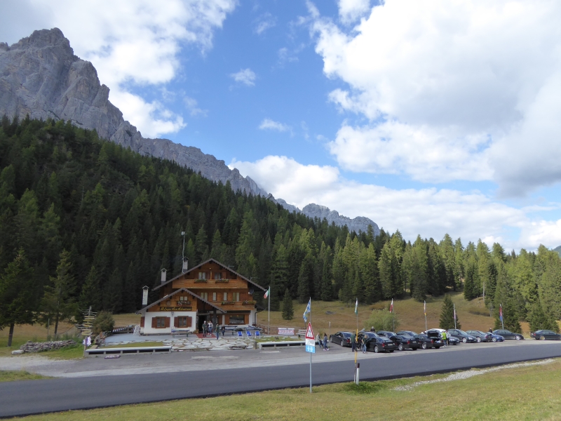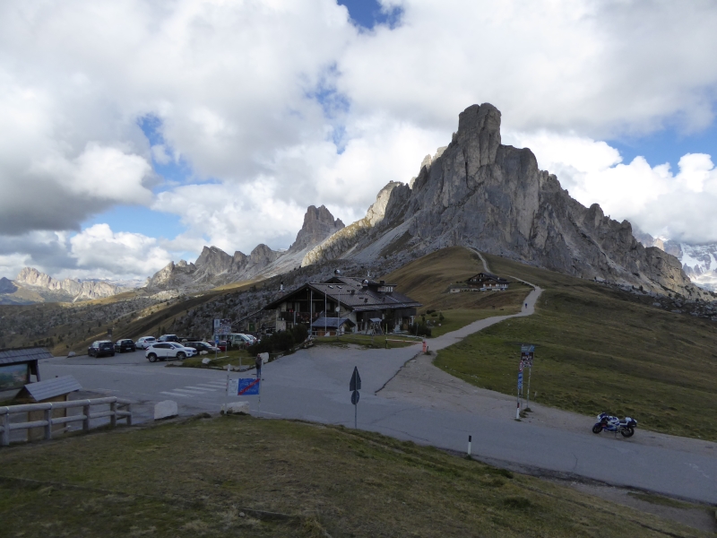 Von Caprile aus folgten wir dem Anstieg auf den Passo Giau (2.233 m). Im Berghotel auf der Passhöhe legten wir die erste Pause ein. Eine Stärkung war erforderlich, nach wieder so viel Kurven. Draußen genossen wir die Aussicht und einige besuchten die kleine Kapelle Chiesa di Giovanni Gualberto. Nicht eindeutig überliefert ist, dass einige Beifahrer um Gottes Beistand gebetet haben sollen.