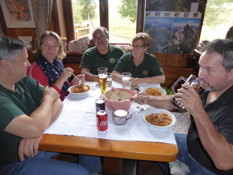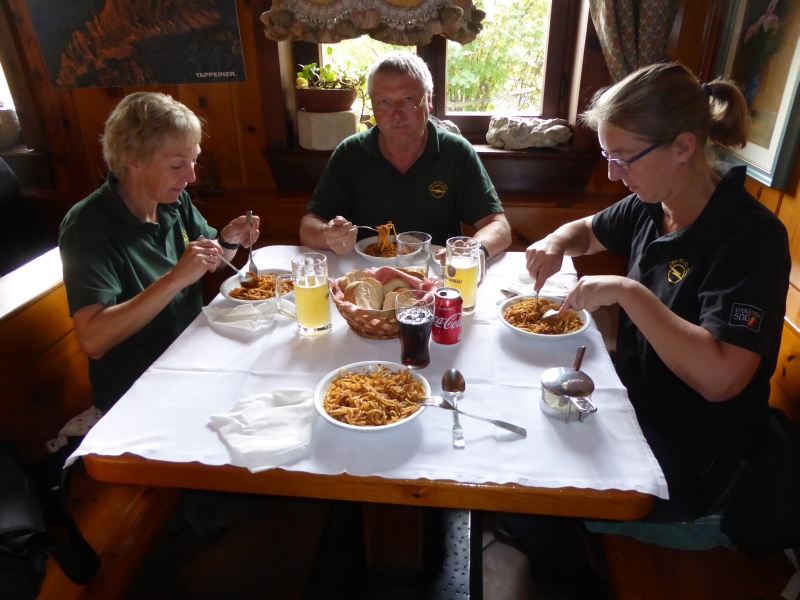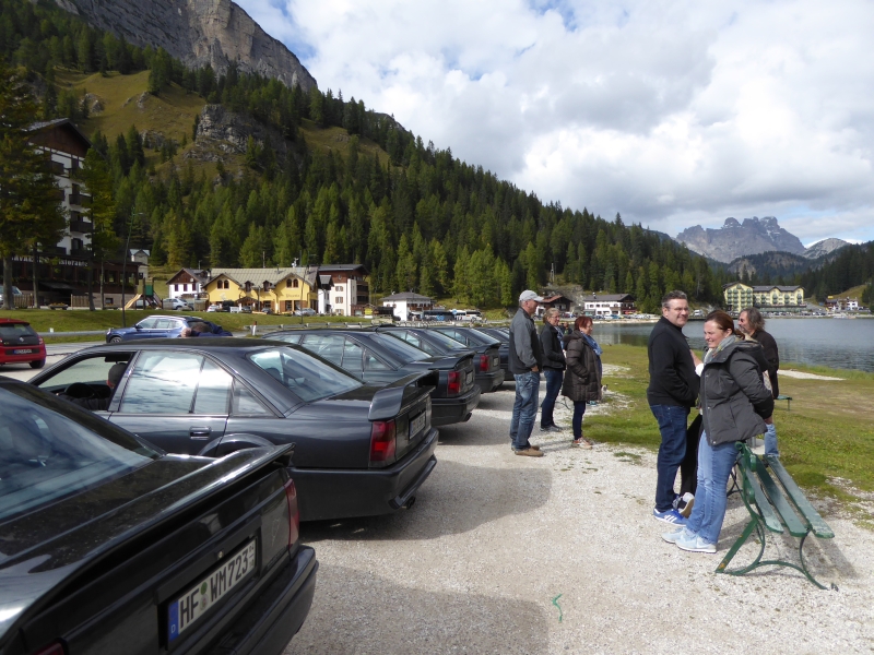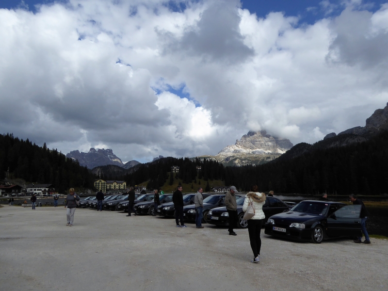 Bei der Ortsdurchfahrt ging Gott sei Dank keiner verloren. Die Stadt verließen wir in östlicher Richtung über den Passo Tre Croci (1.805 m). Eine sehr waldreiche Passstraße mit nicht so vielen Kehren. Angenehm zu fahren. Am Ende des Passes bogen wir links ab und warteten auf den Anblick der Drei Zinnen. Am Lago di Misurina war es dann soweit. Am Uferparkplatz konnten wir die Autos wieder in Reih und Glied aufstellen und die Aussicht genießen. Und in der Pizzeria „Edelweiß“ wartete man schon auf uns. Endlich Pizza und Pasta.