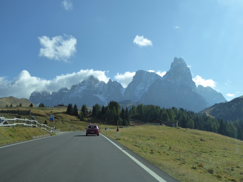 Vor Falcade bogen wir rechts ab und erklommen den Passo di Valles (2.033 m). Auch eine nicht so spektakulärer Passstraße aber mit schöner Aussicht, der nach kurzer Abfahrt aber mit dem Passo di Rolle (1.970 m) eine sehr schöne Strecke folgte. Auf der Ostseite stehen schroffe spitze Felsmassive mit dem 3.192 m hohen Cima di Vezzana und die Straße ist auf der Südrampe hinunter ins Val di Cismon ein Fahrparadies.