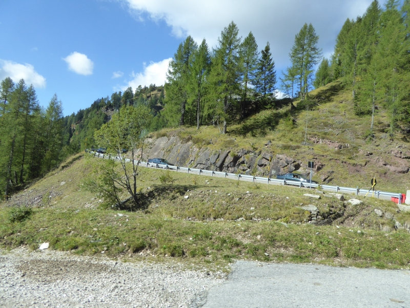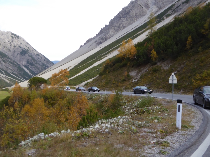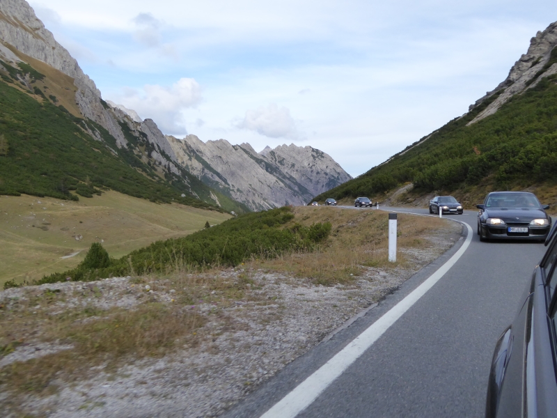 Die Kolonne bewegte sich nach dem Genuss die Ostrampe des Hahntennjoch (1.894 m) hinauf. Die Straße ist ein hochalpine Gebirgsstraße mit schöner Aussicht an der Baumgrenze. Auf der Westseite endet sie im Lechtal. Ich war hier schon in den 60er Jahren, als die Straße nur vom Lechtal bis Bschlabs ein Schotterweg war und die Bewohner oft 5 Monate im Winter von der Außenwelt abgeschlossen waren.