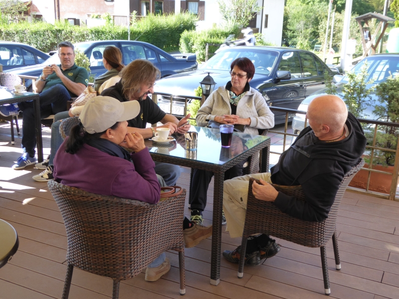 Die Kehren sind nicht so eng und wenn man weiter ins Tal hinunter kommt ergibt sich ein Swing aus zügig fahrbaren Links- und Rechtskurven mit schön glattem Asphalt. Das macht süchtig und Lust auf mehr. Es war schade als wir in Tonadico ankamen. Aber dort haben wir uns mit einem warmen oder kalten Getränk gestärkt und von den Kurven geschwärmt.