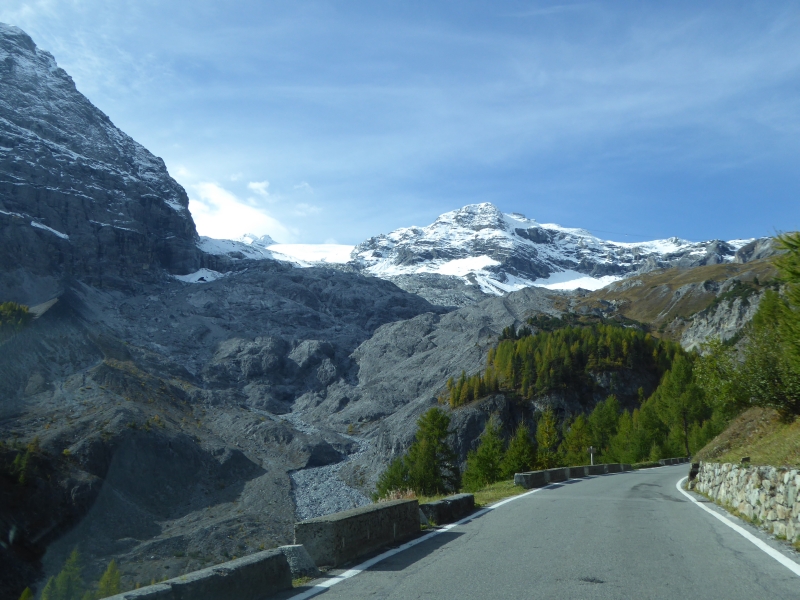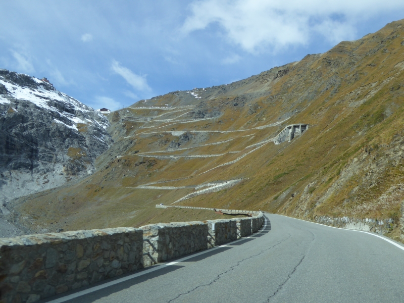 Abgesehen von der Runde über das Stifser Joch war der Weg für alle gleich. Vom Hotel durchs Eggtal bis nach Bozen und von Bozen durchs Etschtal bis Meran. In Meran weiter nach Westen durchs Vinschgau Richtung Reschenpass. Die Gruppe „Nimmersatt“ bog dann links ab und folgte der Beschilderung „Stilfser Joch“. Anfangs noch gemächlich, dann aber in 48 engen Kehren windet sich das schwarze Band wie eine unendliche Schlange den Berg hinauf.