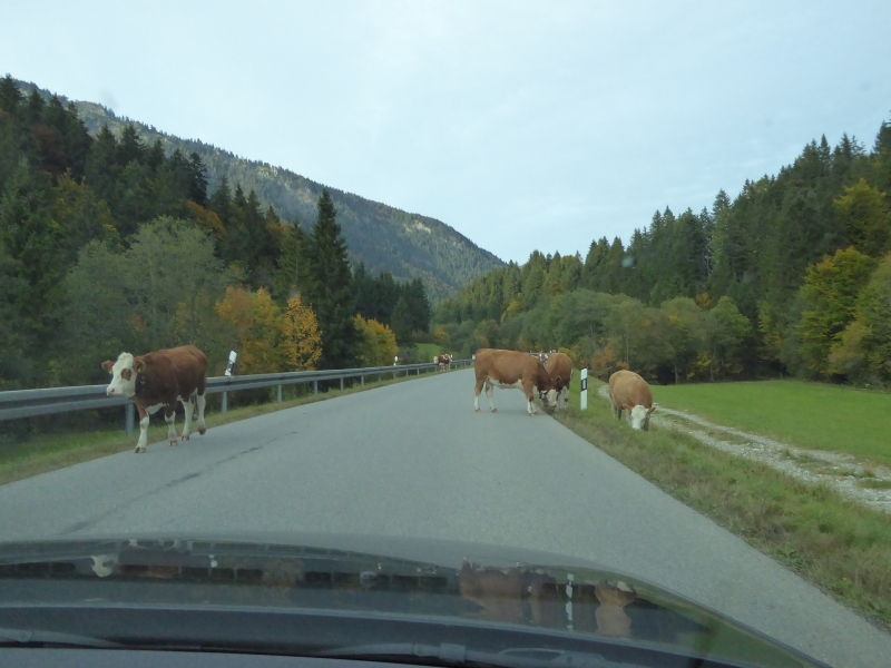 Das Lechtal befuhren wir nur ein kurzes Stück Richtung Reutte in Tirol. Dann hieß links und wieder bergan über den Gaichtpass (1.082 m). Ein eher flacher Pass, der das Lechtal mit dem Tannheimer Tal verbindet. Es war der letzte Pass auf unserer Tour. Der ein oder andere Beifahrer war wohl froh. Das Tannheimer Tal ist ein Hochtal mit breiter Talsohle im österreichischen Teil der Allgäuer Alpen. In Grän bogen wir ins Engetal ab, überquerten die Grenze nach Deutschland und erreichten aus dem dann genannten Achental die Gemeinde Pfronten. Auf dieser Strecke galt besondere Aufmerksamkeit den Rindviechern, also den vierbeinigen.