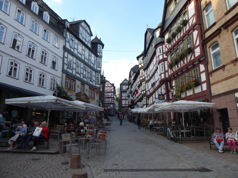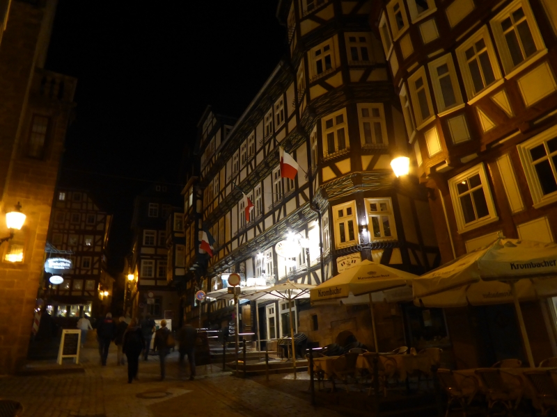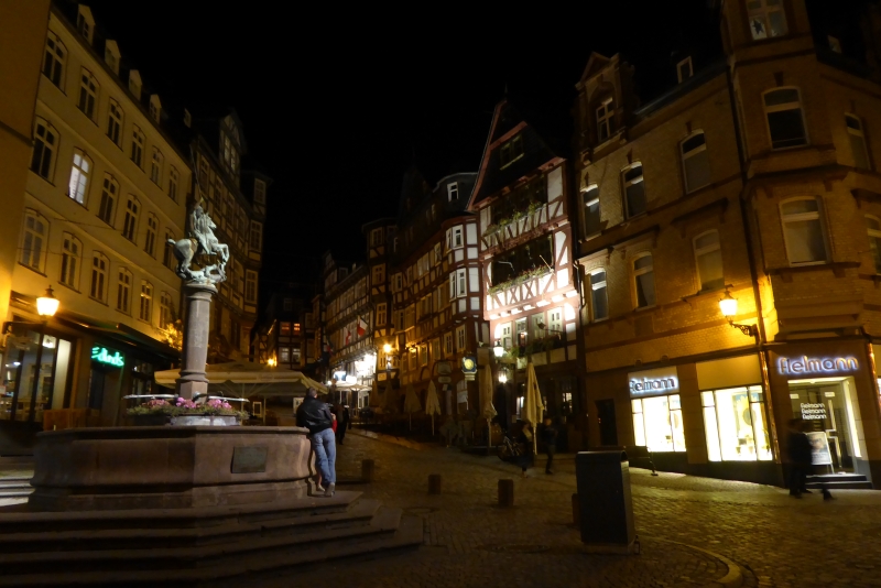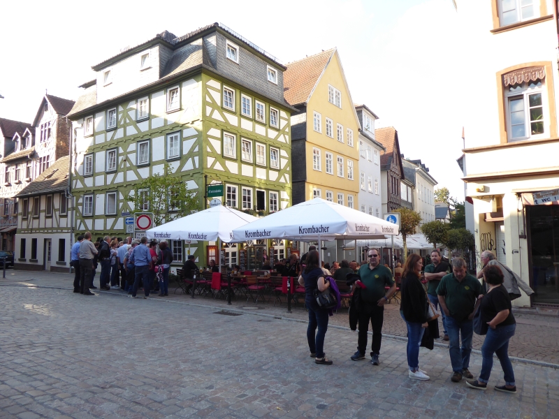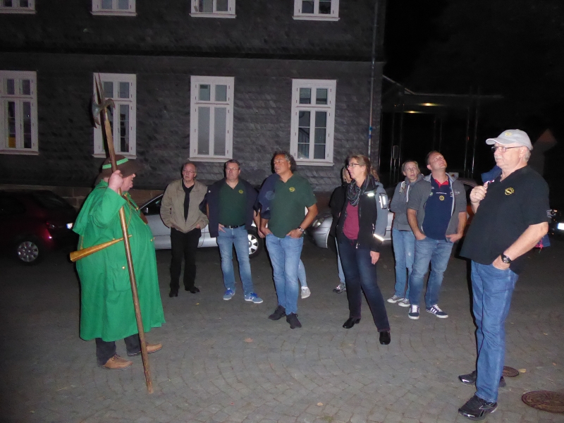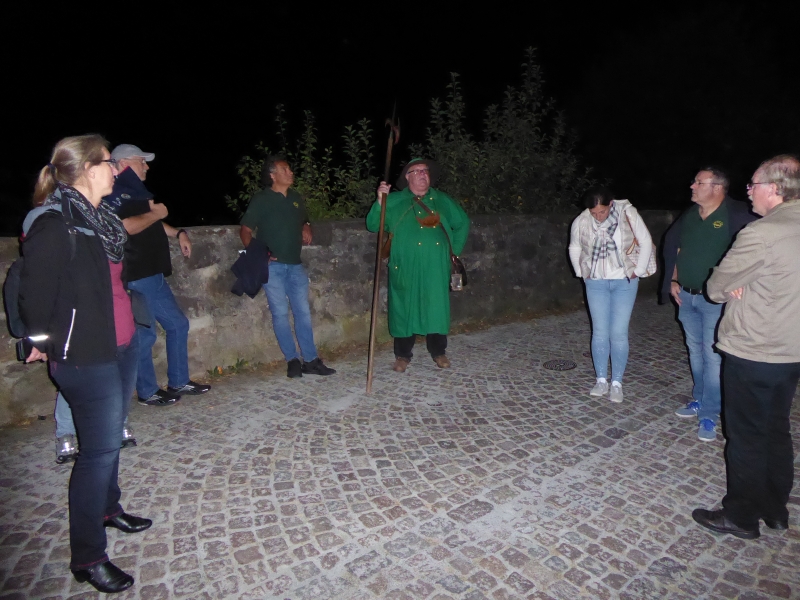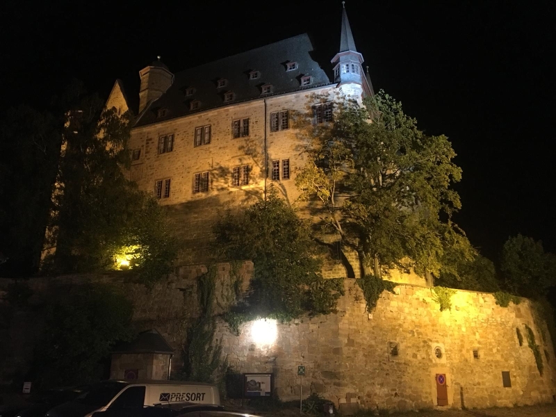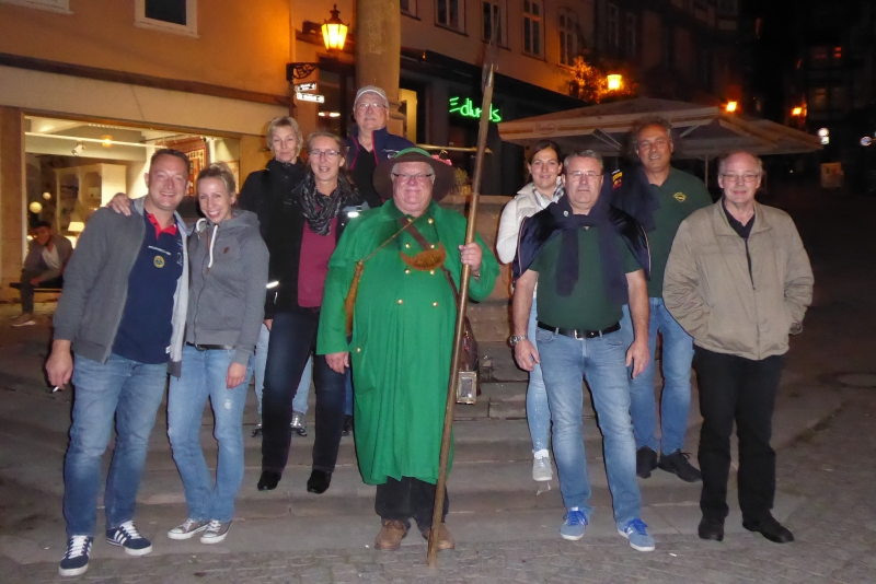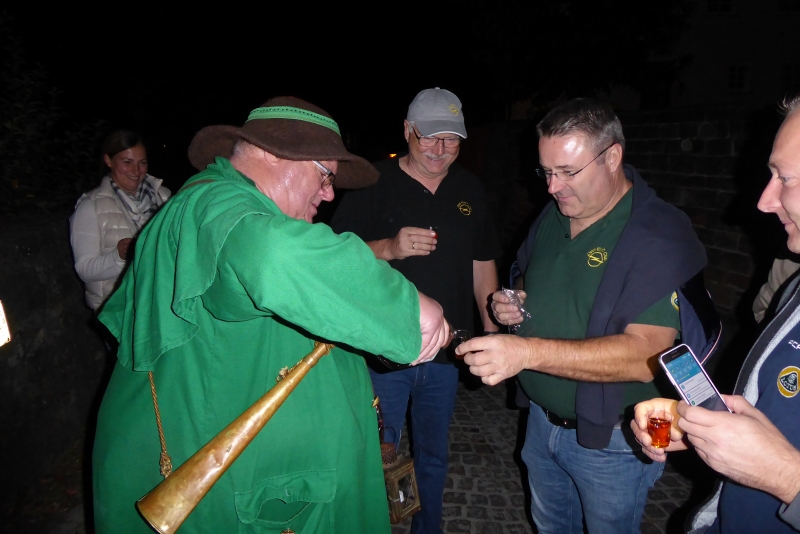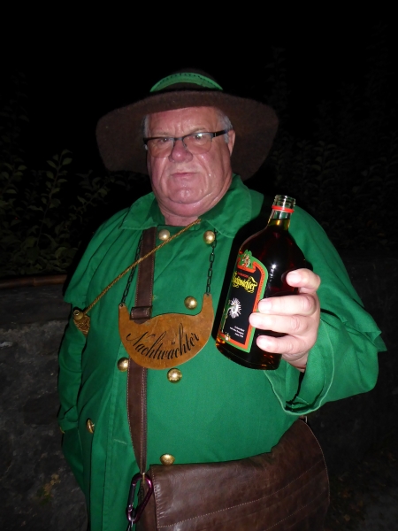 Um 21:30 Uhr konnten wir die Kalorien wieder abtrainieren. In zwei Gruppen aufgeteilt machten wir eine Nachtwächterwanderung durch die Altstadt, von den Einheimischen auch Oberstadt genannt. Vorbei an besonderen Plätzen und Häusern und untermalt mit vielen Anekdoten suchten wir den Weg bis hinauf zum Landgrafenschloss aus dem 13. Jahrhundert. Ganz schön anstrengend mit vollem Bauch. Zwischendurch wurden wir aber vom Nachtwächter mit „Nachtwächter Kräuterlikör“ nach Rezeptur aus 1799 gestärkt. Sonst hätten wir das Auf und Ab auch nicht geschafft. Ganz schön hügelig hier in Marburg. Am Ende unseres Streifzuges hatten wir zwei Flaschen vom Kräuterlikör getrunken. Also die andere Gruppe auch zwei! Da war die Blutverdünnung schon spürbar.