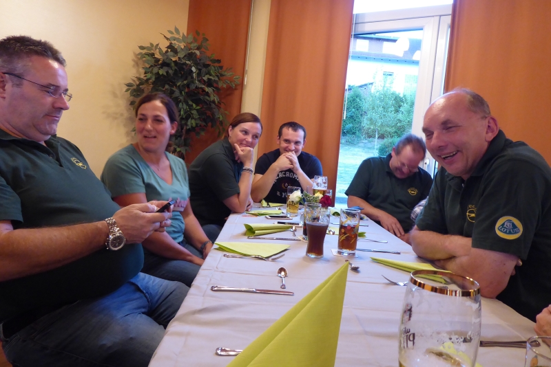 Das Organisationsteam hatte sich, ohne dass ich Verdacht schöpfte, zum Ziel gesetzt, mich an diesem Abend dem Lotusgrün ganz nahe zu bringen. Meine Vermutung: In der Vorbereitung dazu wurde ich abwechselnd zu erhöhtem Bierkonsum verführt und die Farbe Grün immer wieder zum Thema in unseren hochgeistigen Gesprächen an der Bar gemacht. Es endete mit meiner zu Anfang dieses Berichtes genannten Gesangseinlage „Grün, grün, grün……..“. Die Lotusfahrer wähnten sich schon am Ziel, den Clubpräsidenten vom grünen Lotus überzeugt und den Verkauf seines schwarzen EVO eingeleitet zu haben